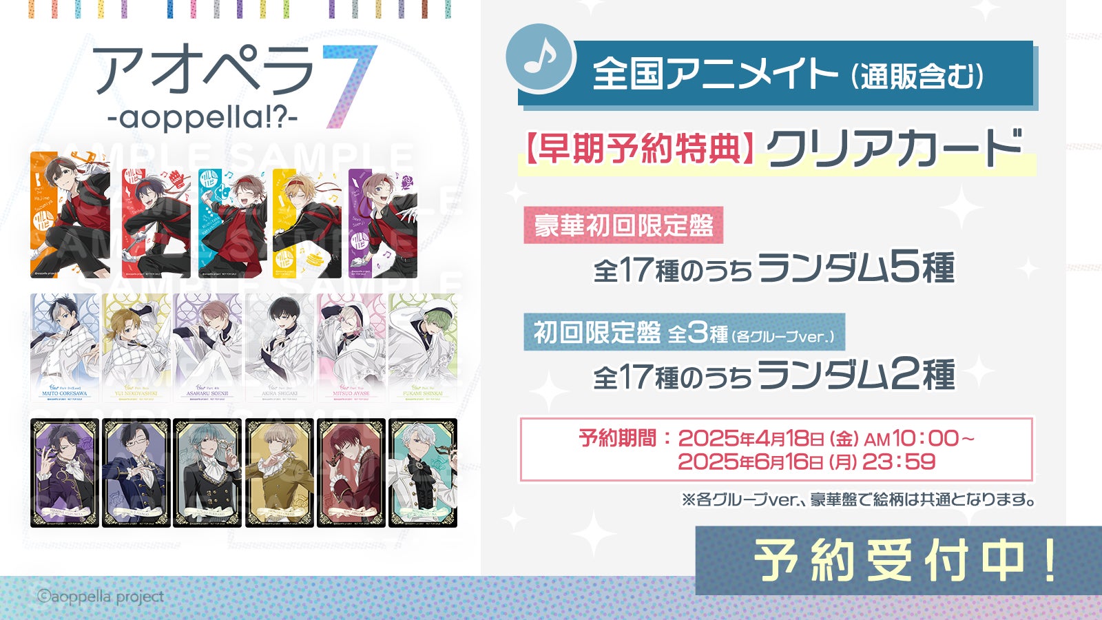 CD「アオペラ -aoppella!?- 7」は、各グループごとの新曲を収録した「初回限定盤」のほか、新規3曲全てを収録した「豪華初回限定盤」の全4形態展開となっております。さらに各商品には、MV衣装を着用したアオペラメンバー17人のブロマイドや、現在「アオペラ」公式YouTubeチャンネルにて公開している「ストーリームービー2章」のフルボイス版も収録予定です。