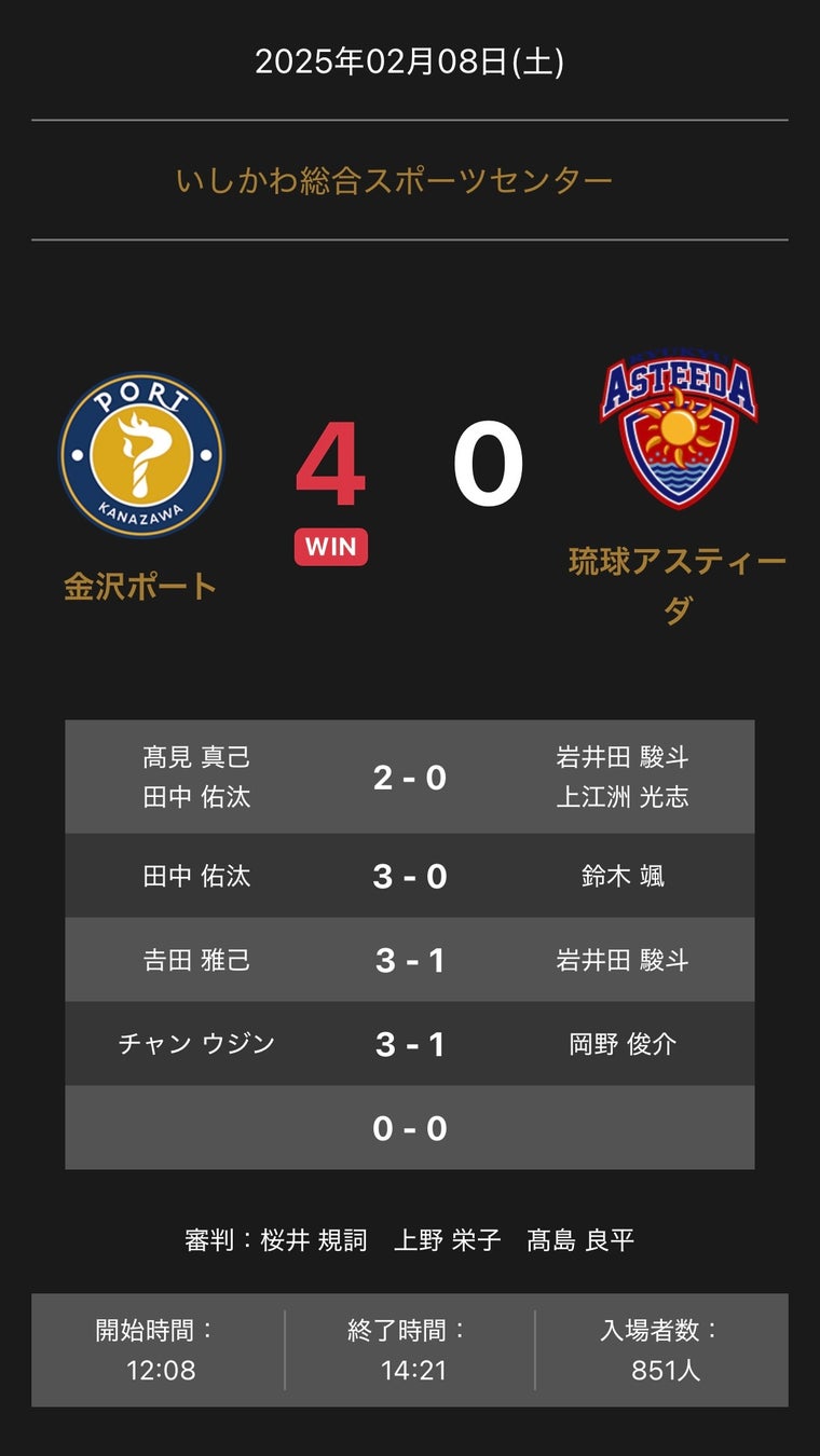 ノジマTリーグ 2024-2025シーズン 公式戦 2月8日開催 「金沢ポート vs 琉球アスティーダ」の試合は、4-0で金沢ポートが勝利しました。
