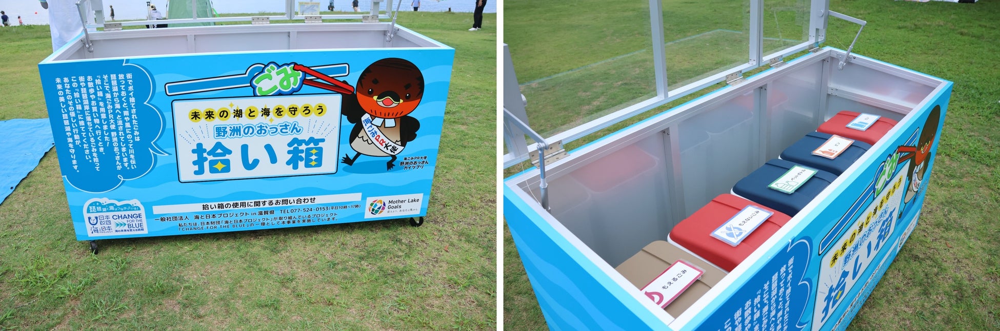 拾い箱とは、清掃活動で市民が拾ったごみを回収するもので、市民の自発的な清掃活動の輪を広げることを目的としています。今回のイベントでお披露目したのは、滋賀県の人気キャラクター「野洲のおっさんの拾い箱」です。拾い箱には、海洋ごみのことや清掃活動へのメッセージが書かれ、中はごみを分別して収納できるようになっています。この拾い箱は2023年9月17日(日)から10月1日(日)までの約2週間の間、休暇村 近江八幡に設置されます。滋賀県では、高島市や彦根市でも既に活用されていて、現在も次の展開を進めています!