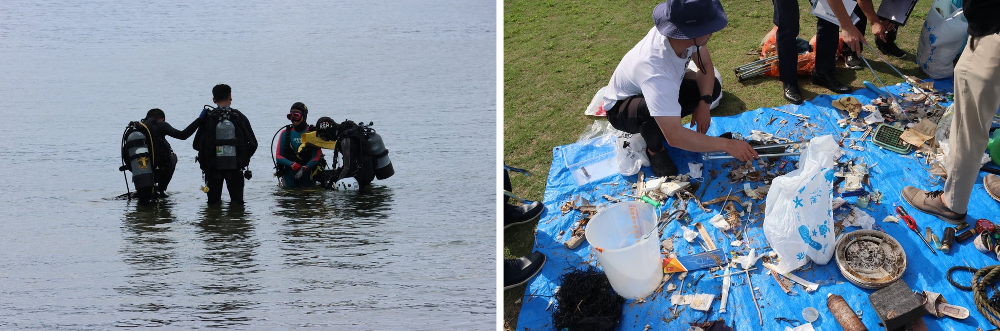 イベントでは、ダイバーによる湖底の清掃活動も行われました。湖底で拾ったごみの中にはペットボトルや靴など色々な種類のごみがあり参加者もびっくり。この日1日で100kg分のごみを拾いました。実際にごみを見ることにより海やびわ湖の大切さを訴えることができました。
