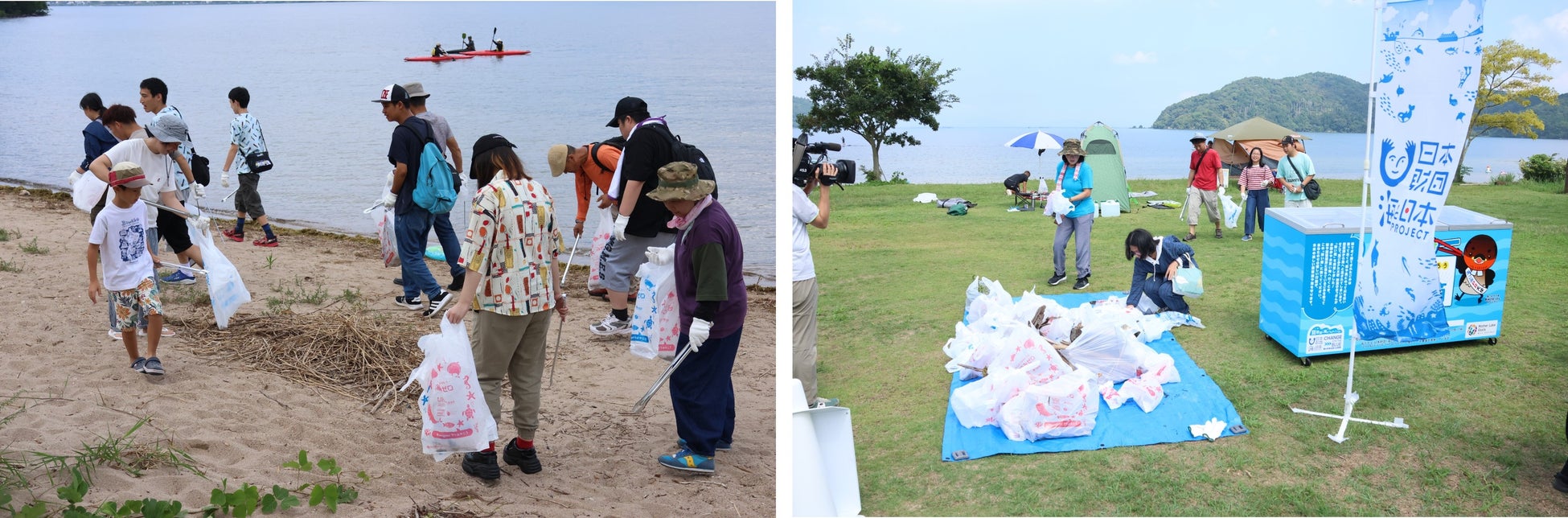 設置式のあとは、湖岸でごみ拾いをしました。「私たちもごみ拾いに参加していいいですか」など飛び入り参加の親子連れもいて、いつでも気軽に清掃活動ができることが伝えられました。参加者からは「初めて拾い箱を知った」「びわ湖や海をこれからもきれいにするためにごみを拾っていきたい」などの声もあり、海洋ごみについて考える良い機会になりました。