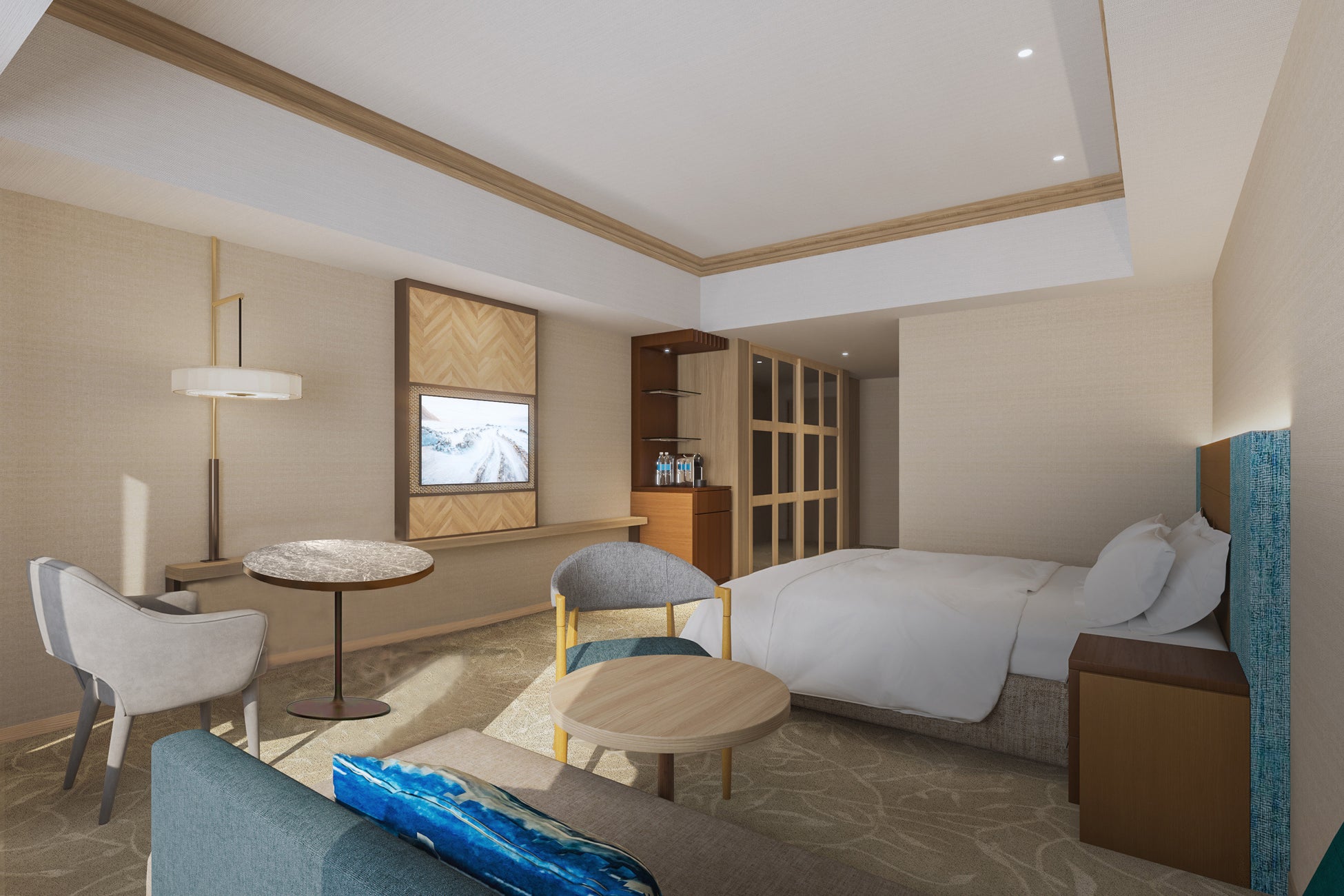 新たに誕生する「スカイビューフロア」では、開業から35年を迎えたホテルオークラ神戸の伝統を継承したオーセンティックなスタイルをテーマに、現代的な快適性を取り入れた客室をご用意します。ウォーターフロントに位置するホテルらしく、水辺からインスピレーションを受けたデザインをインテリアに採用するほか、神戸のシンボル・六甲山の自然を表現したブルーグリーンをアクセントにすることで、神戸の景観に寄り添った空間に仕上げました。また、今回のリニューアルでは、客室内の調度品を見直し、ライティングデスクの代わりにお食事やワークタイムなど幅広い滞在シーンに対応できるマルチテーブルを設置しました。窓辺にはソファやアームチェアを配置しており、くつろぎながら神戸の景色をじっくりとお楽しみいただけます。お客様におくつろぎいただけるよう、快適な客室を整え、より心地よいホテルライフを提供いたします。