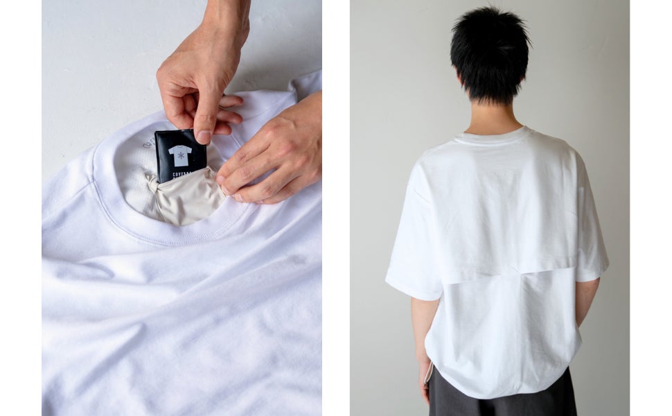 Tシャツ背面内側、首付近にアイスパックを入れるためのヒミツのポケットを配置。ポケットには断熱材を用いることで、程よい冷たさになるよう配慮しています。保冷剤が外から見て浮かないよう、背面外側はヨーク仕立てに。