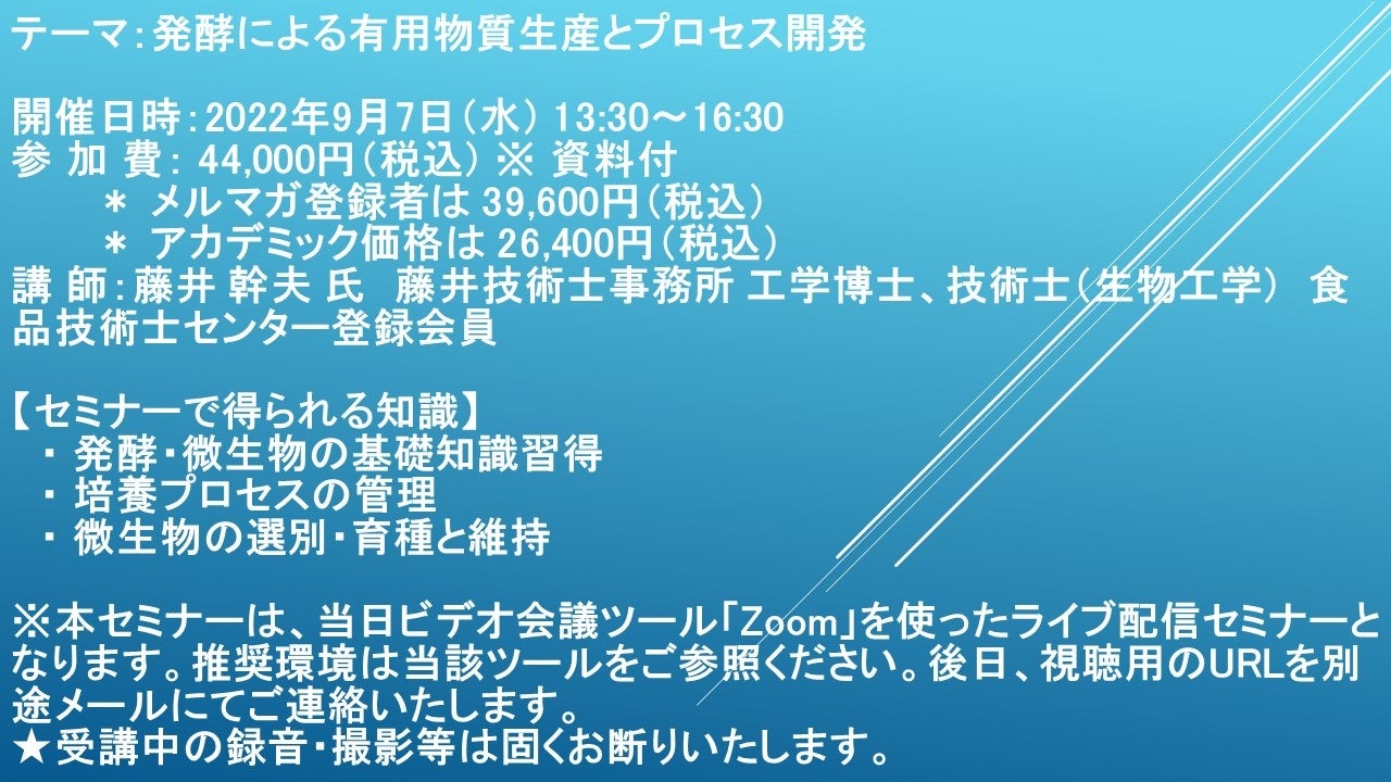先端技術情報や市場情報を提供している(株)シーエムシー・リサーチ(千代田区神田錦町: https://cmcre.com/ )では、 各種材料・化学品などの市場動向・技術動向のセミナーや書籍発行を行っておりますが、 このたび「発酵による有用物質生産とプロセス開発」と題するセミナーを、 講師に藤井 幹夫 氏 藤井技術士事務所 工学博士、技術士(生物工学) 食品技術士センター登録会員)をお迎えし、2022年9月7日(水)13:30より、 ZOOMを利用したライブ配信で開催いたします。 受講料は、 一般:44,000円(税込)、 弊社メルマガ会員:39,600円(税込)、 アカデミック価格は26,400円(税込)となっております(資料付)。