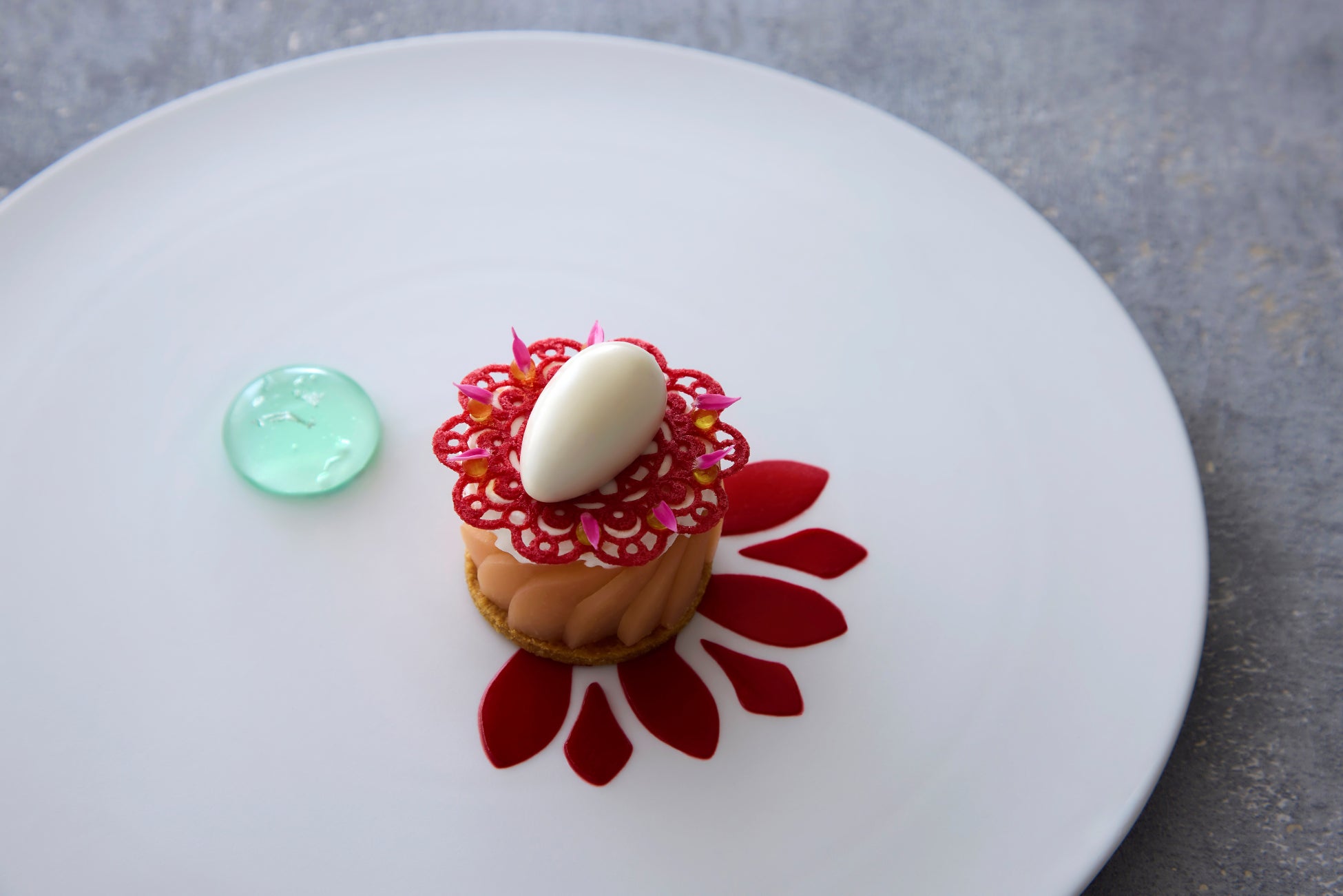 彩り豊かな美しい見た目と香り、食感すべてをご堪能いただけるこの季節にふさわしい涼やかなデザートです。桃のコンポートを主役に、まるで雫のように添えられたミントソースは、植物性由来の材料で作られたベジタブルゼラチンで包み込んでいます。