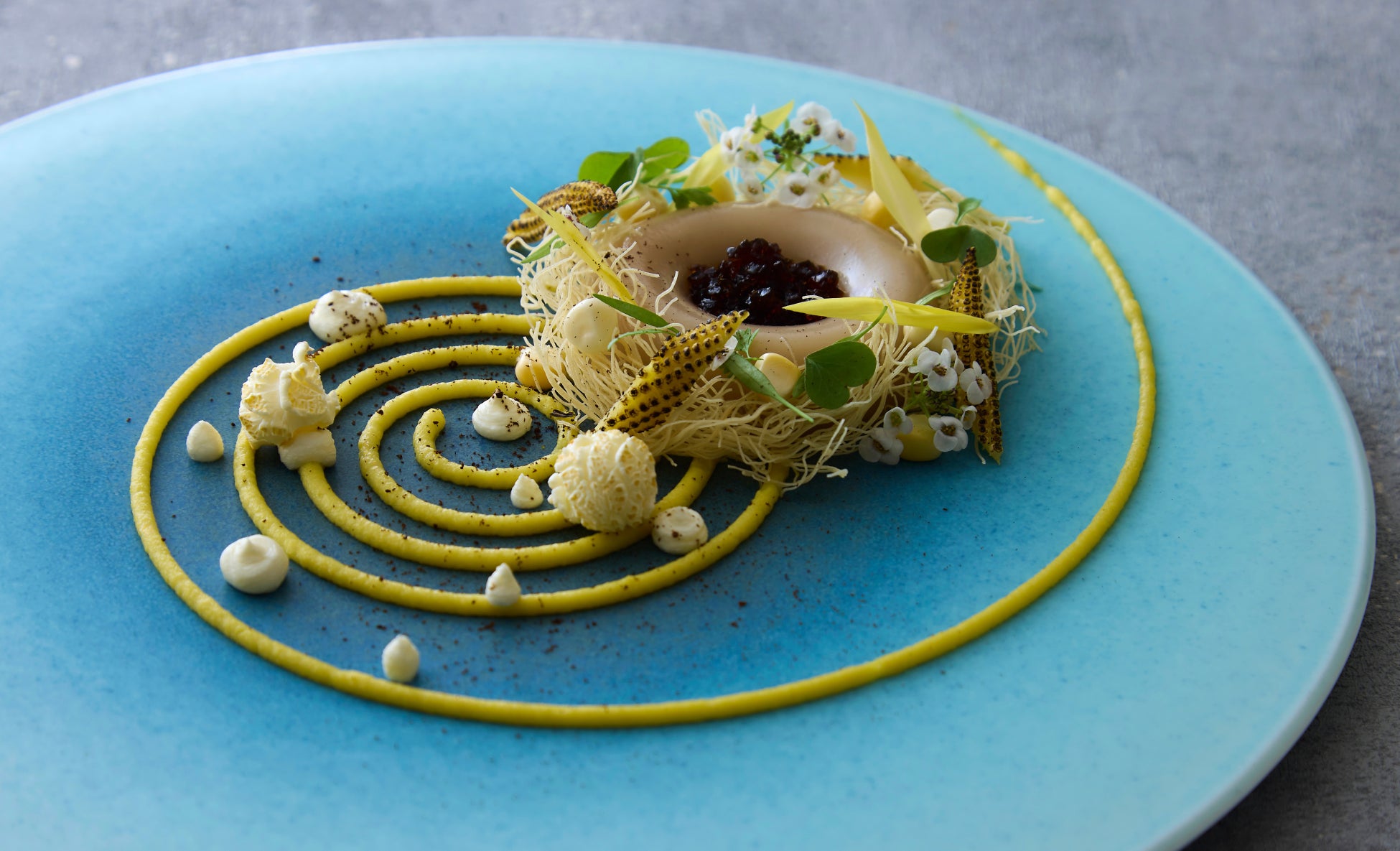 ・玉蜀黍(とうもろこし)とアーモンドミルクのブランマンジェ エスプレッソのアクセントと様々な食感のアンサンブル