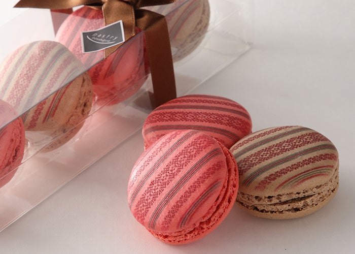 博多織の献上柄をまとったマカロンはギフトに最適です。ルビーチョコレート&ジャンドゥージャチョコレートをサンドしました。(要冷蔵)