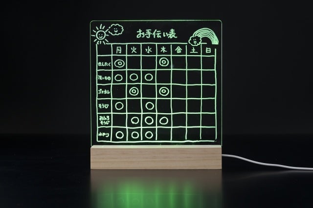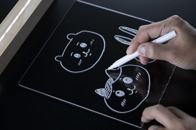 プラモデルやフィギュア、おもちゃなどのディスプレイとして、このLEDアクリルメモボードを活用する人も多いだろう。大切な家族やペットの似顔絵やイラストを描くのも楽しい。ライトは7色で切り替えられるので印象も変えられるのだ。