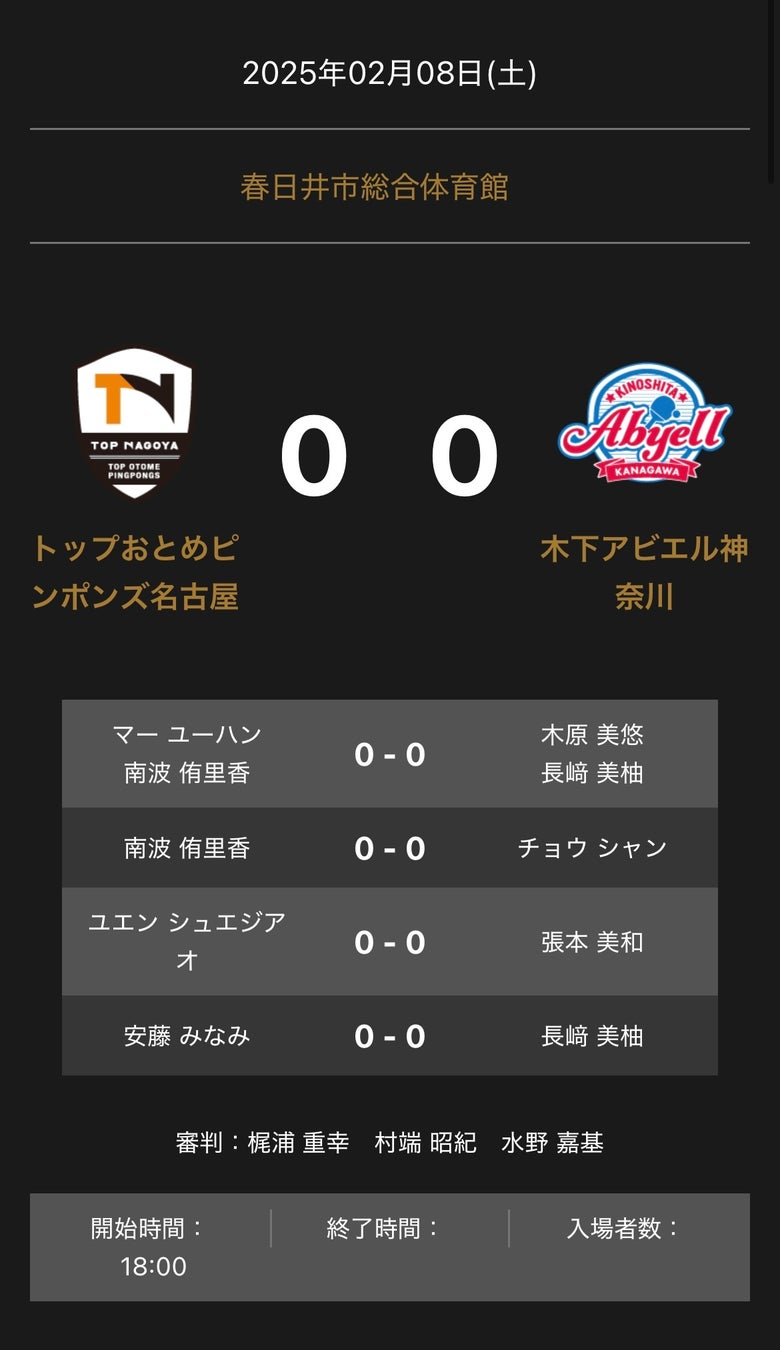 ノジマTリーグ 2024-2025シーズン 公式戦 2月8日開催 トップおとめピンポンズ名古屋 vs 木下アビエル神奈川 対戦オーダー発表