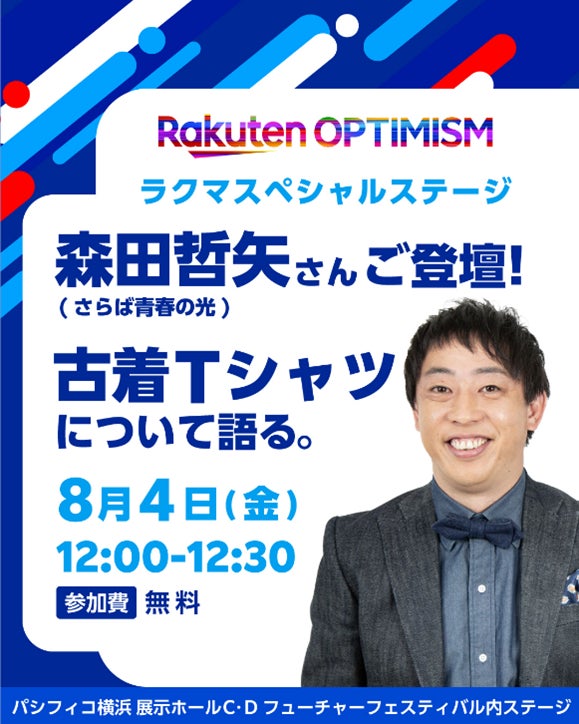 8月4日(金)には、古着好きとして知られる森田 哲矢さん(さらば青春の光)をお招きし、「#ラクマTシャツ市」で取り扱われる古着Tシャツをテーマに古着愛を語っていただくスペシャルステージを開催します。本ステージはどなたでも無料で参加することができます。