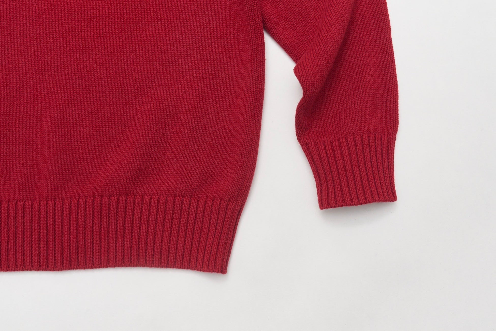 ゲージとは、編機の針の密度を表す単位。数字が大きくなるほど、編み目の細かい生地になる。このコットンニットは5ゲージ。ローゲージと呼ばれる部類に当たるが、糸を何本も撚って密度高く編んでいるため、伸びにくく、しっかりとした重量感もあり、されどゴワゴワせずにしなやか。