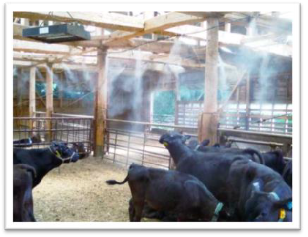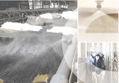 粒の粗い水滴を牛体に直接噴出してびしょびしょに濡らし、そこにファンの風を当てることで、水分が乾く際の「気化熱」を利用して牛の体温を確実に下げます。運用コストは水道代とごく僅かな電気代のみで、低ランニングコストでの運用が可能です。[出展社:ラクトシステム株式会社]