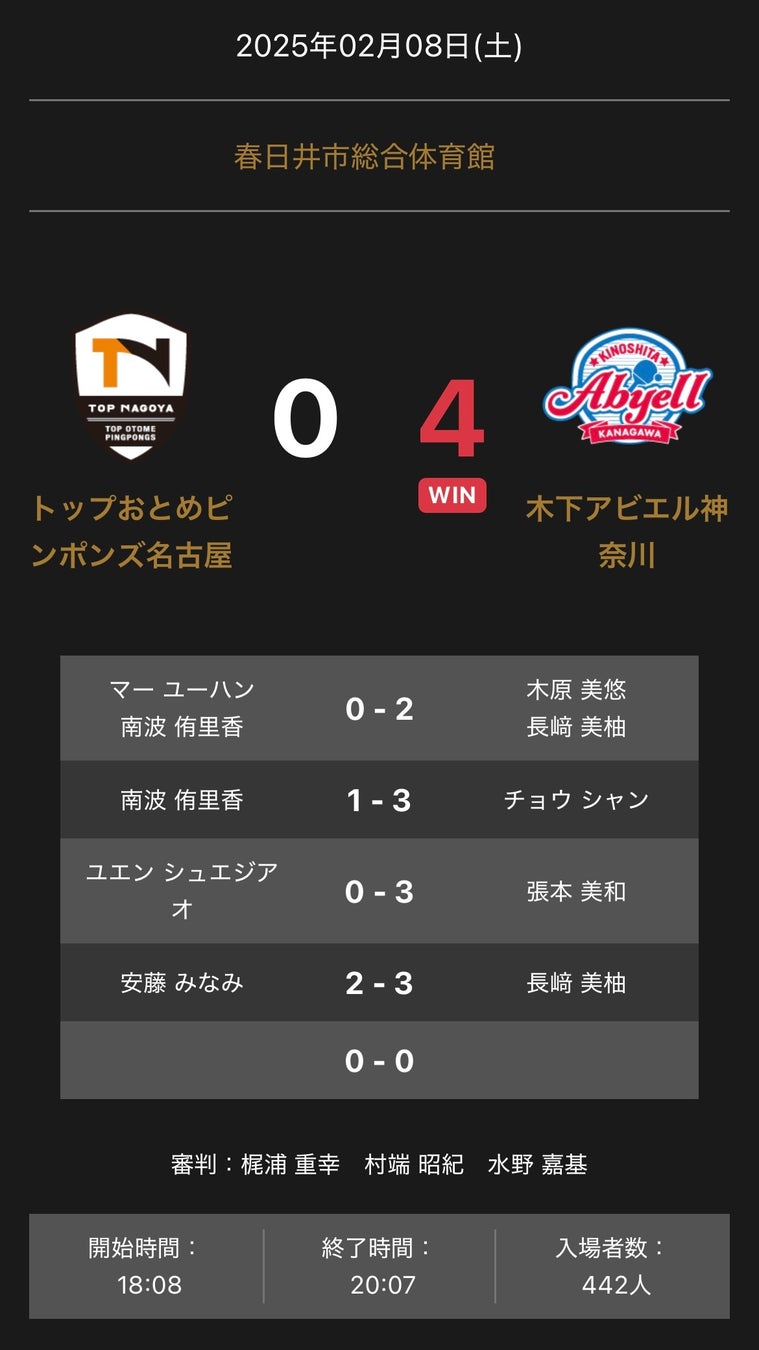 ノジマTリーグ 2024-2025シーズン 公式戦 2月8日開催 「トップおとめピンポンズ名古屋 vs 木下アビエル神奈川」の試合は、4-0で木下アビエル神奈川が勝利しました。