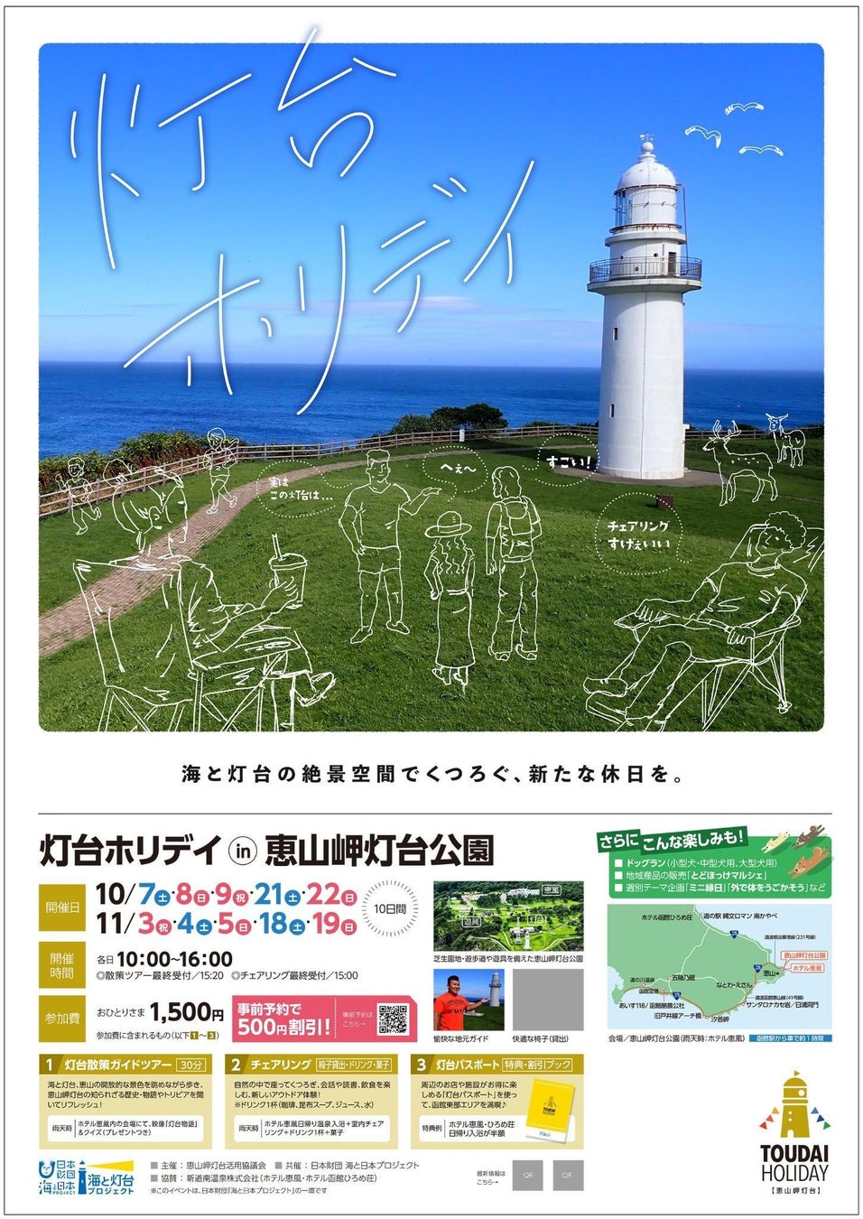 参加費に含まれるもの | ①灯台散策ガイドツアー 約30分 ②チェアリング体験(快適な椅子の貸し出し、ドリンク1杯、菓子) ③特典・割引ブック「灯台パスポート」。「ホテル恵風」「ひろめ荘」日帰り温泉や、道の駅「なとわ・えさん」、食堂、和菓子店などで特典・割引が受けられます。 |