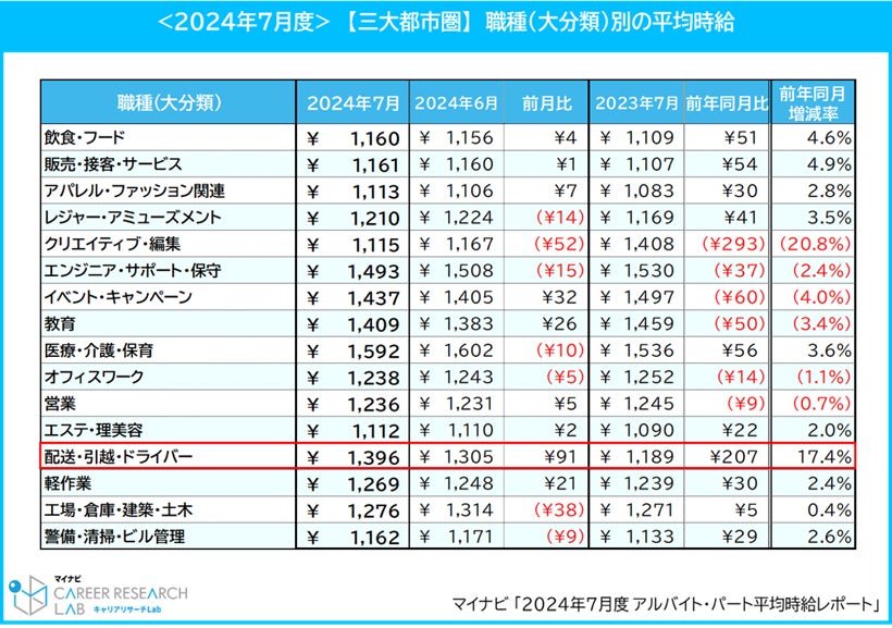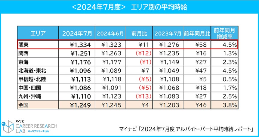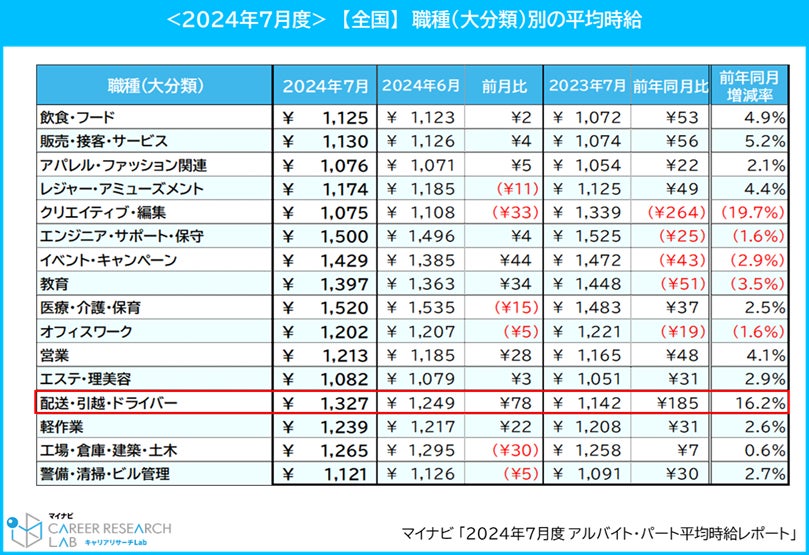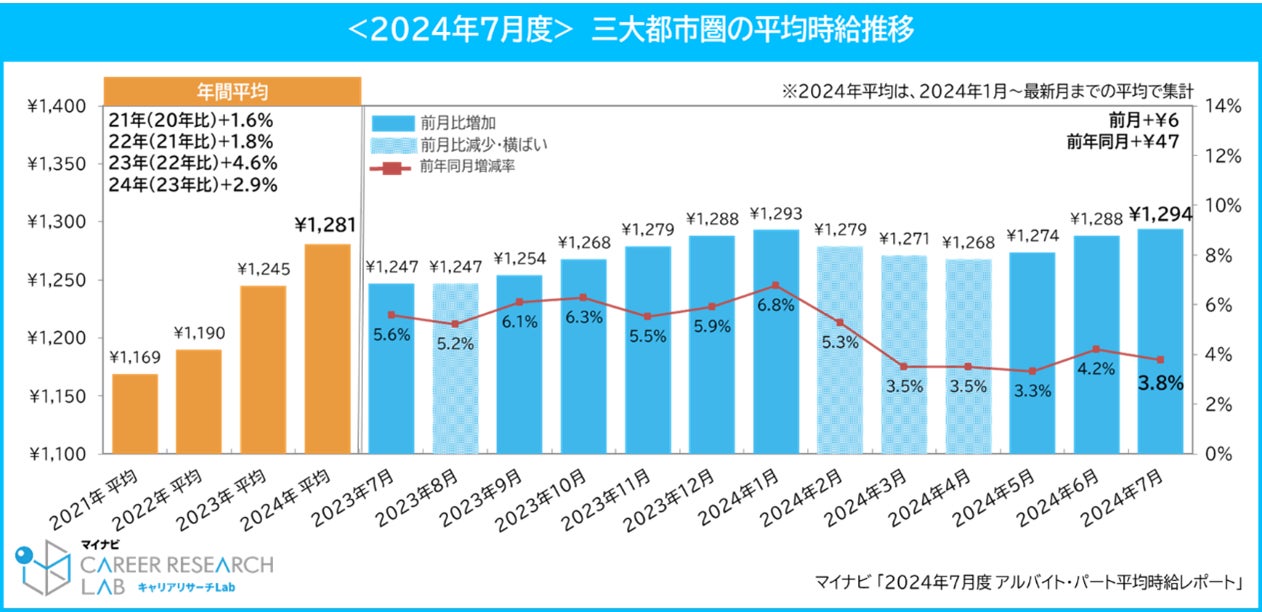 マイナビ、「2024年7月度アルバイト・パート平均時給レポート」を発表