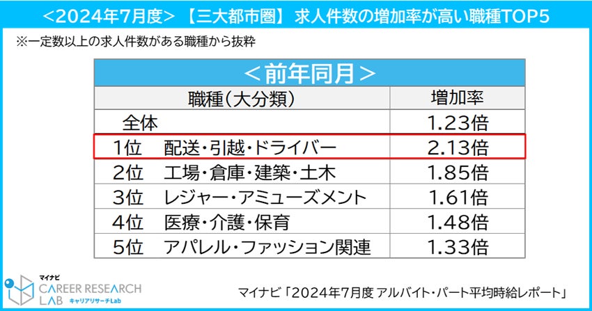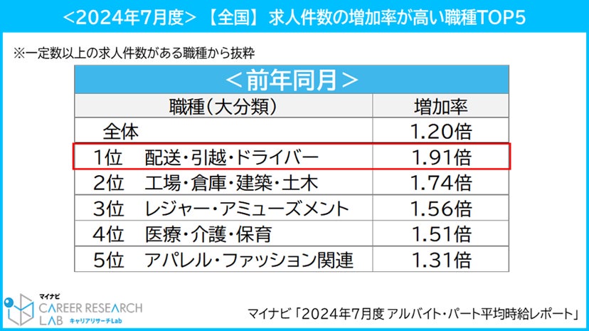 24年7月の全国平均時給は1,249円。 [配送・引越・ドライバー]の時給は1,300円台に突入し、求人件数も前年同月と比べて約2倍増。半導体工場が新設された「北海道」の時給は1,145円