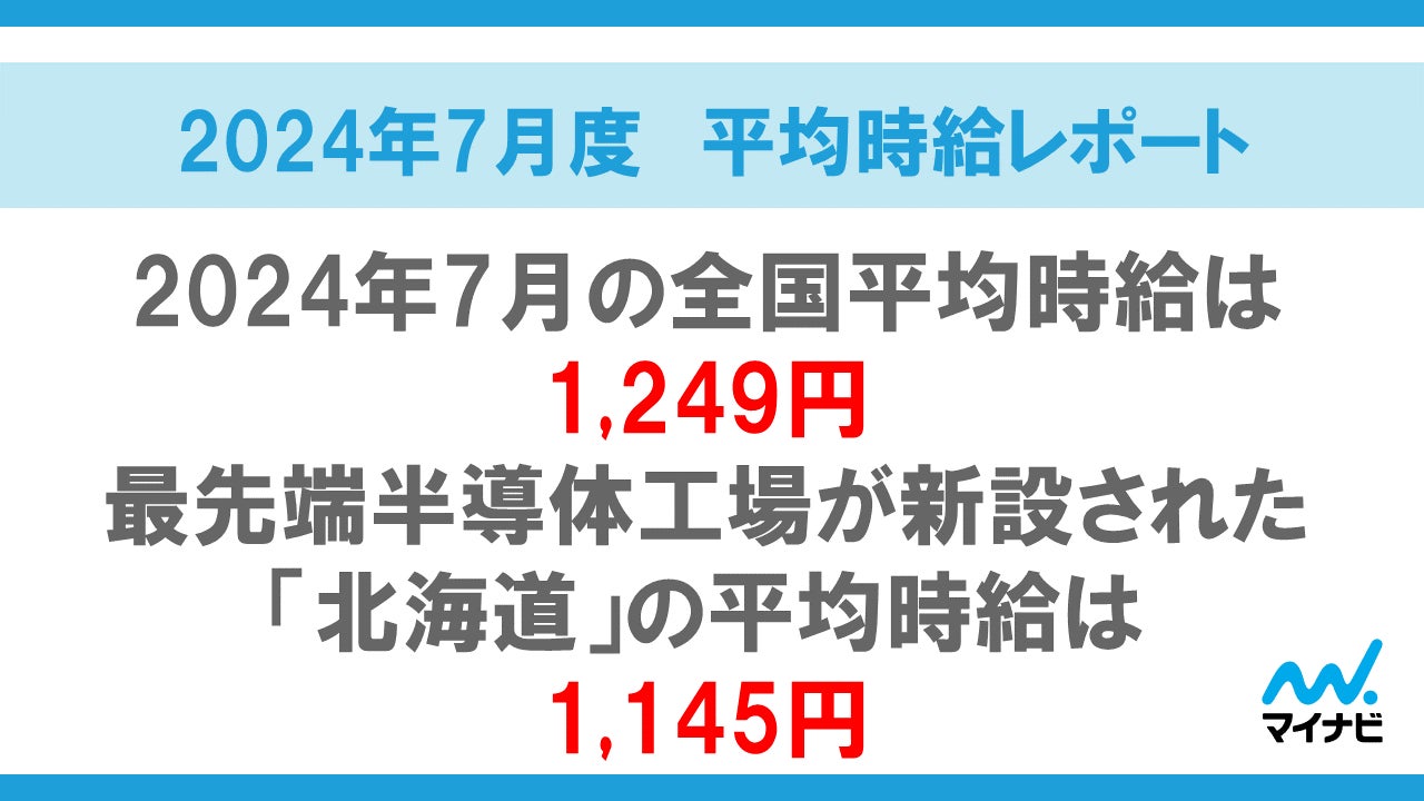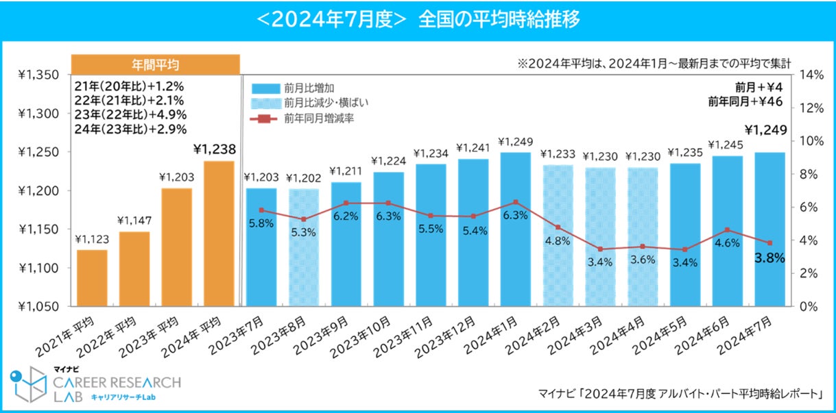 2024年7月の全国平均時給は1,249円で24年1月の最高額と並ぶ結果に