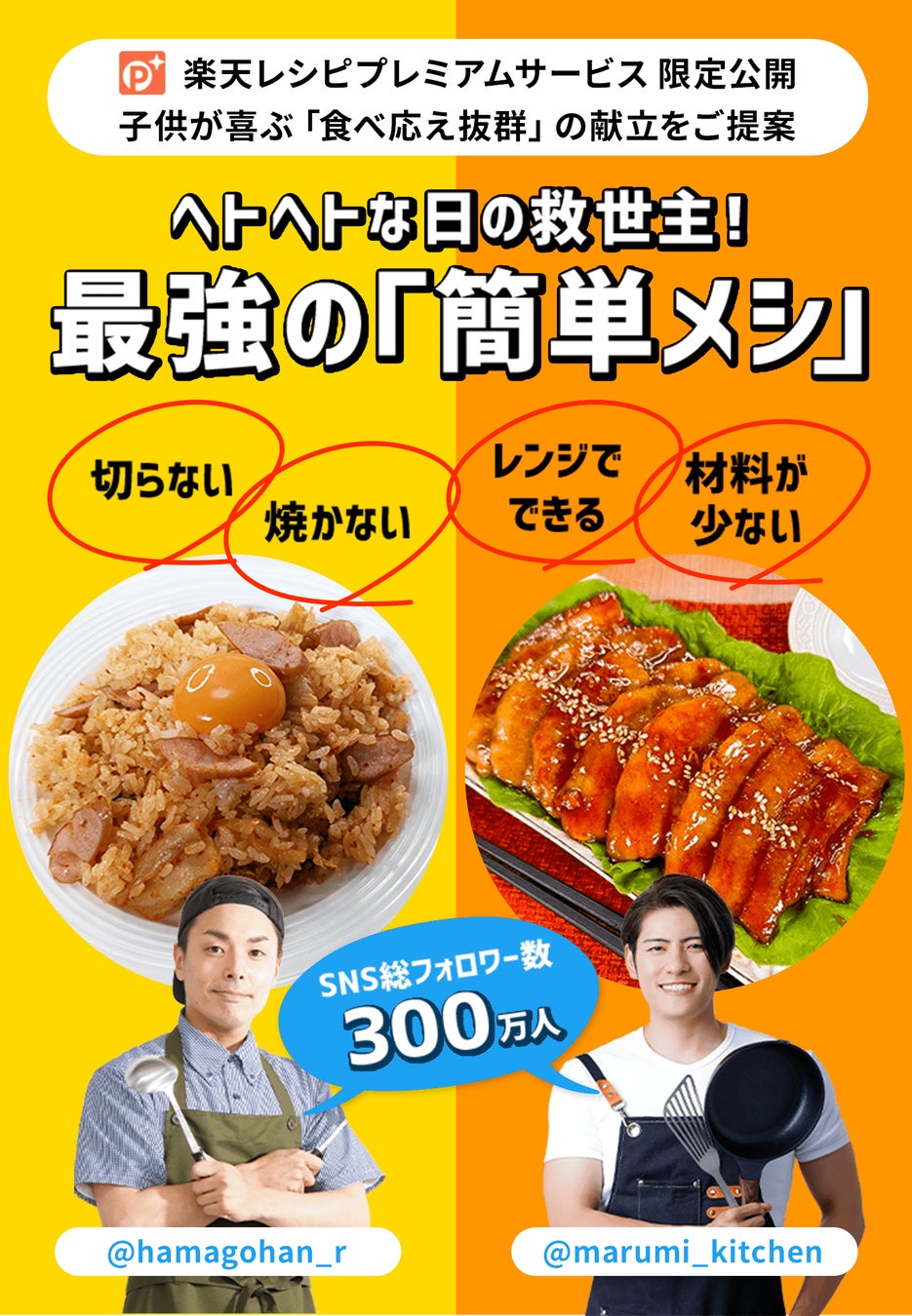 - 第1弾は「ヘトヘトな日の救世主!最強の『簡単メシ』」をテーマに「ハマごはん【お手軽レシピ】」さん、「まるみキッチン」さん考案のレシピを公開 -