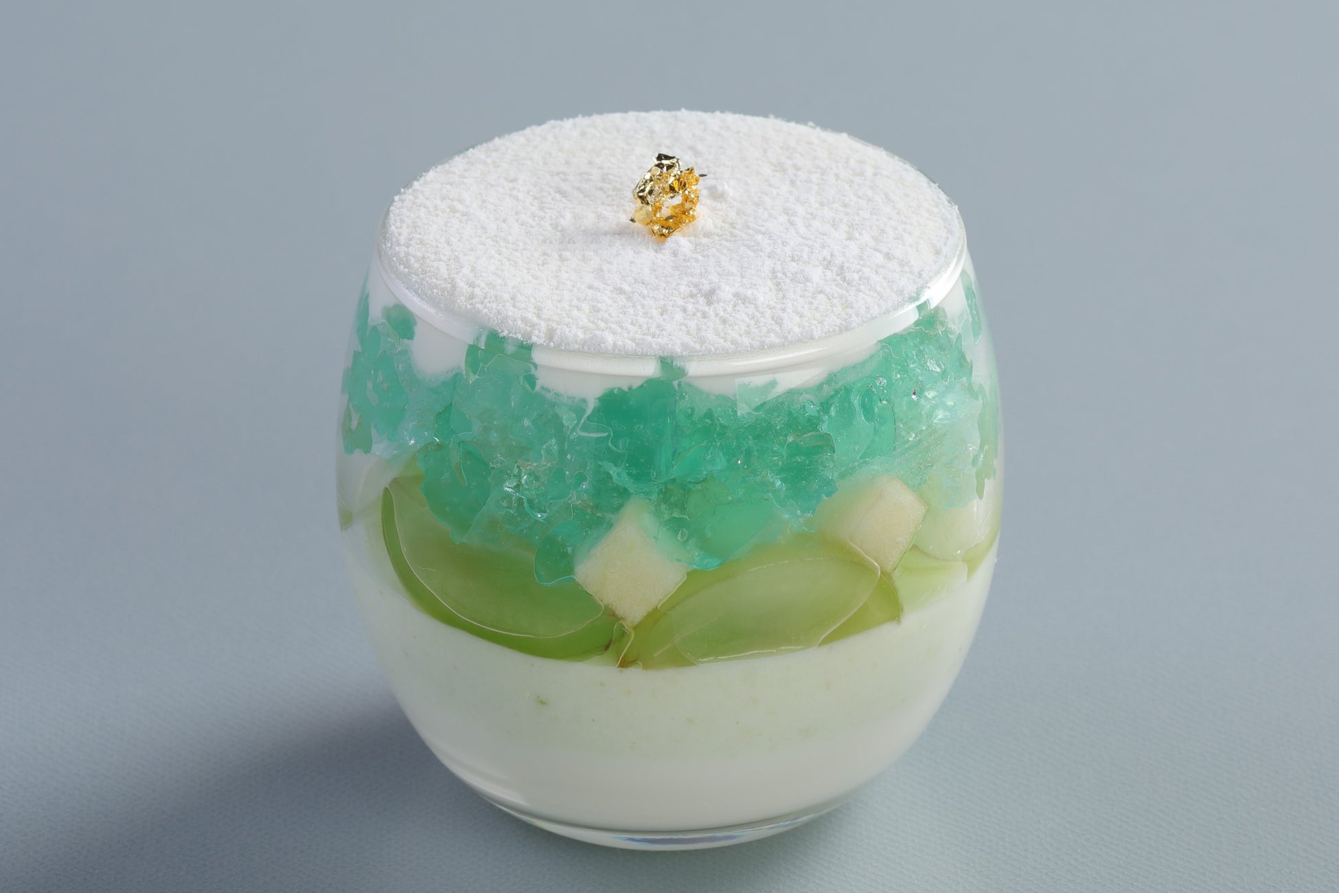 マスカット風味のパンナコッタに青リンゴのムースを重ね、マスカット、リンゴ、ブルーキュラソーのジュレを層にし、氷の世界を表現しました。