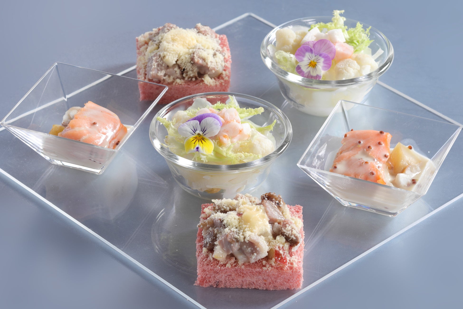 海老と小貝柱の白いサラダ / サーモンとじゃがいもの粒マスタードクリームソース /