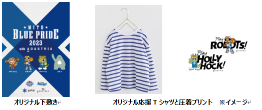 MITO BLUE PRIDEをより多くの方に知っていただくため、水戸駅周辺にて「MITO BLUE PRIDE 2023 with ADASTRIA スタンプラリー」を実施します。期間中に水戸駅周辺の施設内に配置されたスタンプを集めると、10月18日(水)のイベントにて小学生以下を対象に、先着順で当社よりブルーのボーダーTシャツにロボスケとホーリーくんの圧着プリントを施したオリジナルTシャツを10名さま、またアダストリアがデザインしたオリジナル下敷きを100名さまにプレゼントします。さらに、10月22日(日)に開催される茨城ロボッツと水戸ホーリーホックでの試合会場でもご観戦いただいた方には先着順で同デザインの下敷きを配布予定です。