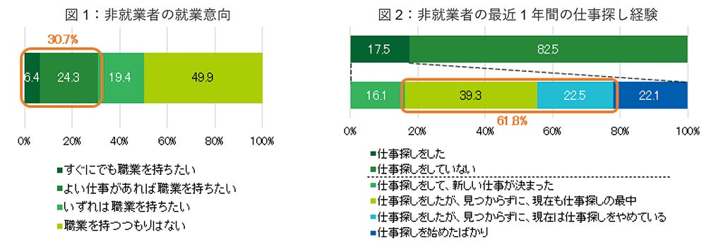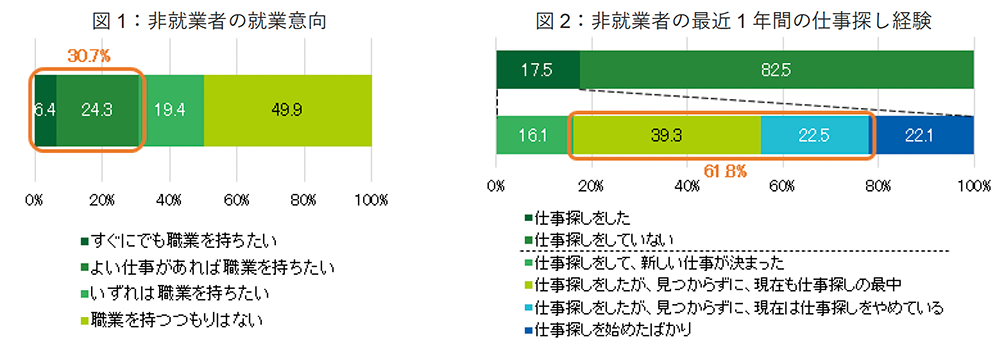 非就業者(n=3,980)のうち今後の就業意向について、「すぐにでも/よい仕事があれば職業を持ちたい」と回答した人は30.7%でした(図1)。また、非就業者のうち、最近1年間(2022年3月~2023年2月)で実際に仕事探しをした人は17.5%で、そのうちの6割は「仕事探しをしたが、見つからずに、現在も仕事探しの最中/現在は仕事探しをやめている」と回答しました(図2)。現在は非就業だが、働きたいと思っている人や実際に仕事探しをしている人でも、仕事が見つからない人が一定数いることが分かります。