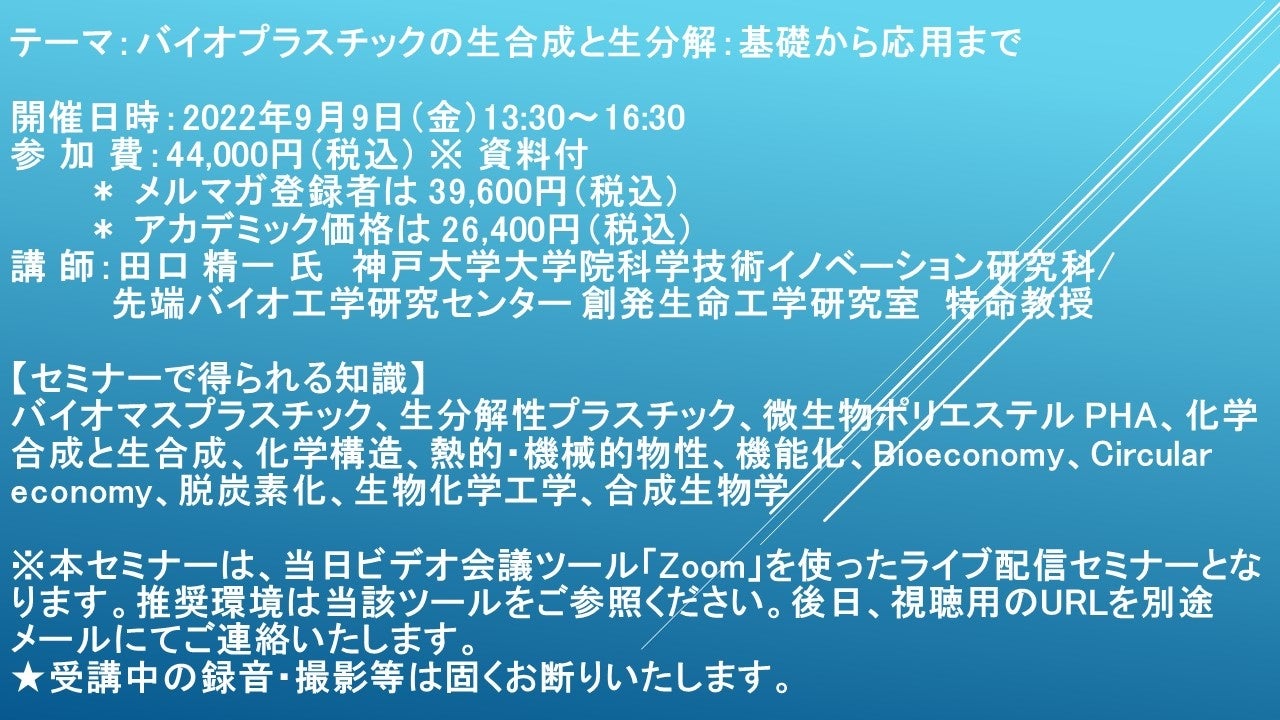先端技術情報や市場情報を提供している(株)シーエムシー・リサーチ(千代田区神田錦町: https://cmcre.com/ )では、 各種材料・化学品などの市場動向・技術動向のセミナーや書籍発行を行っておりますが、 このたび「バイオプラスチックの生合成と生分解:基礎から応用まで」と題するセミナーを、 講師に田口 精一 氏 神戸大学大学院科学技術イノベーション研究科/先端バイオ工学研究センター 創発生命工学研究室 特命教授)をお迎えし、2022年9月9日(金)13:30より、 ZOOMを利用したライブ配信で開催いたします。 受講料は、 一般:44,000円(税込)、 弊社メルマガ会員:39,600円(税込)、 アカデミック価格は26,400円(税込)となっております(資料付)。