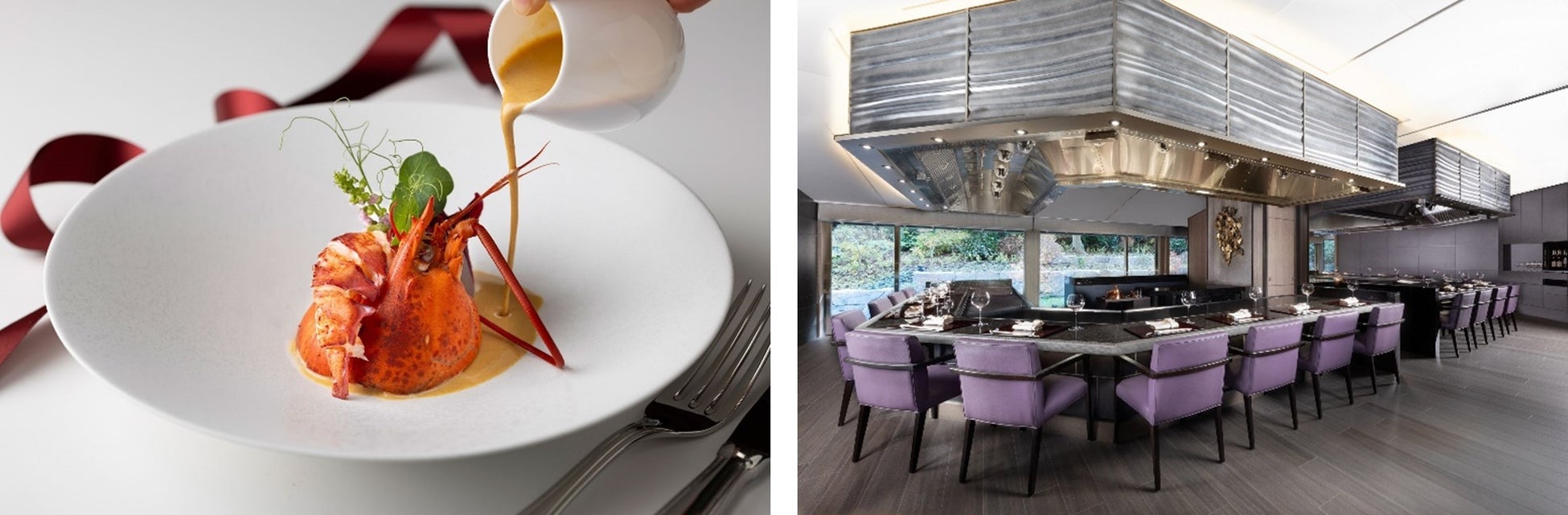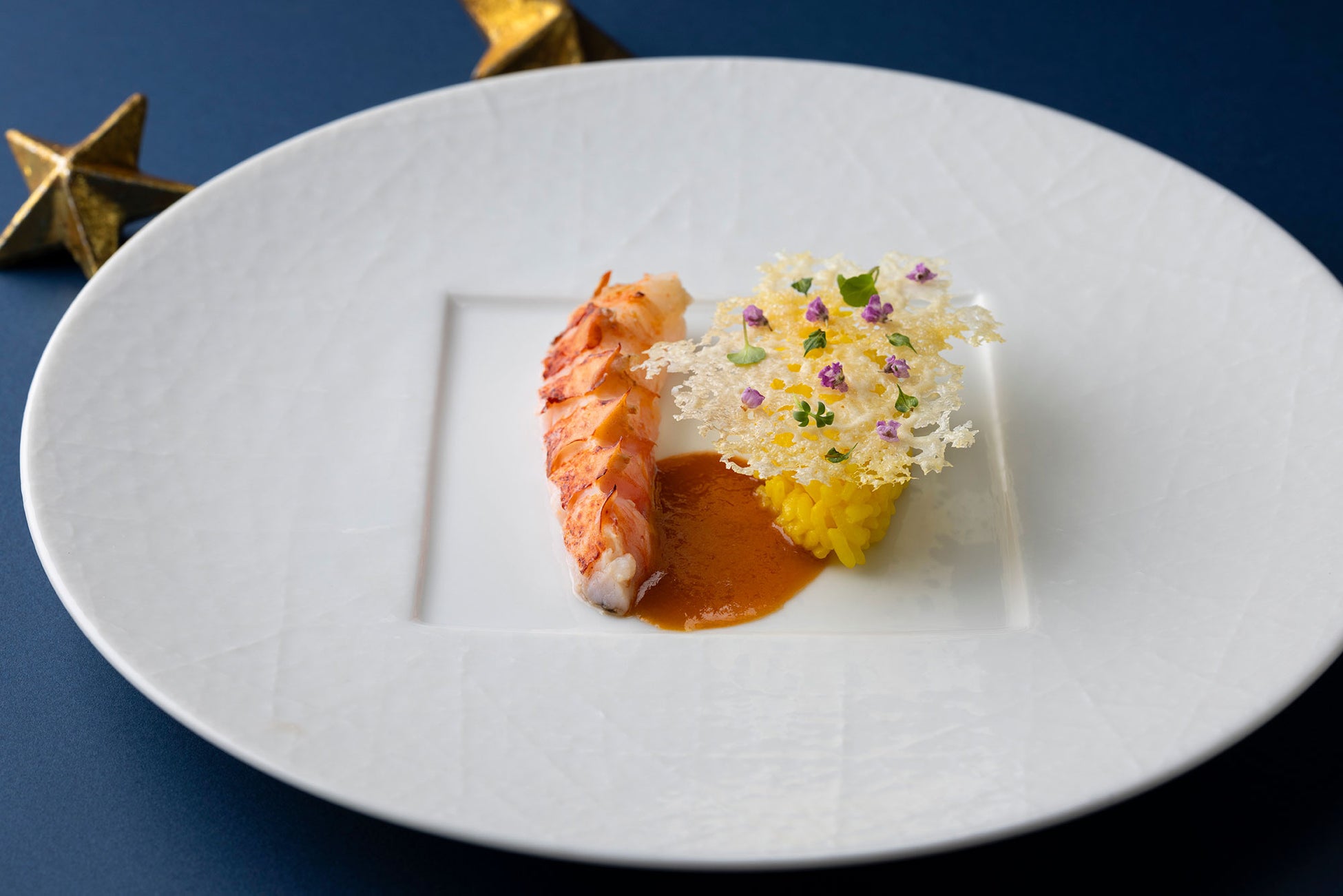 クリスマス期間限定の鉄板焼コースをご用意しました。前菜は、活けオマール海老に爽やかなカレー風味のソースを合わせたナージュ仕立ての一品です。