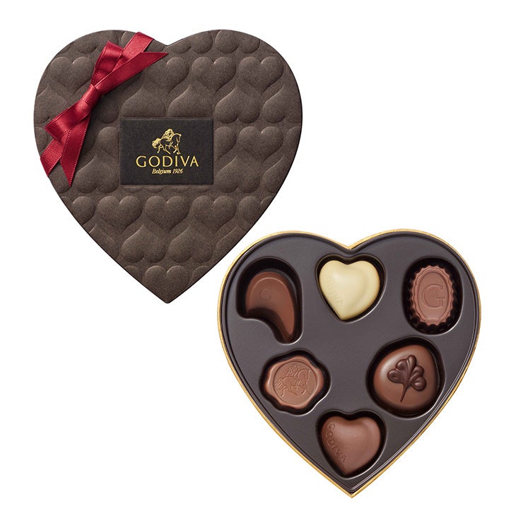 なめらかなヘーゼルナッツプラリネをまろやかなホワイトチョコレートでコーティングした白いハート型のクール ブランなど、ゴディバゴディバの伝統的なモールドチョコレートをセレクトしてハートの形のボックスに詰め合わせました。