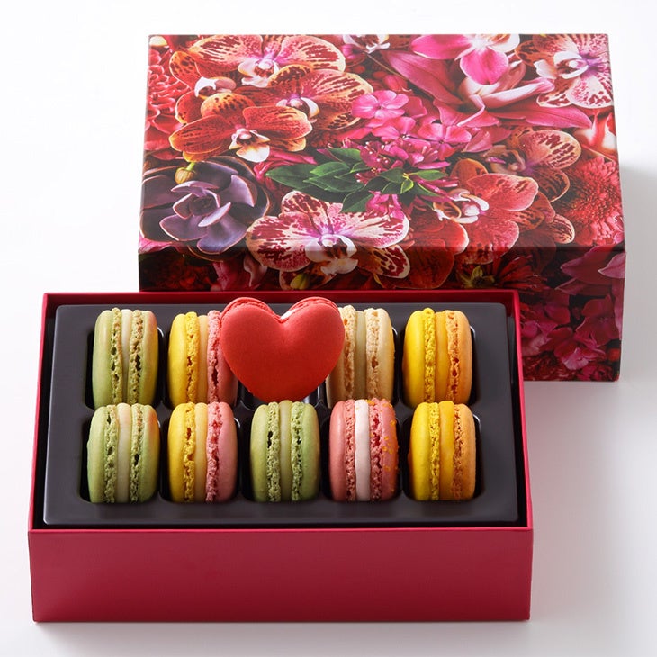 ピエール・エルメ・パリ初登場の「マンゴーパッション」やイチゴとヴァーベナの「ジャルダンドプランタン」、真っ赤なハート形の「クールアンフィニマンローズ」などカラフルで華やかなマカロンの詰め合わせ。