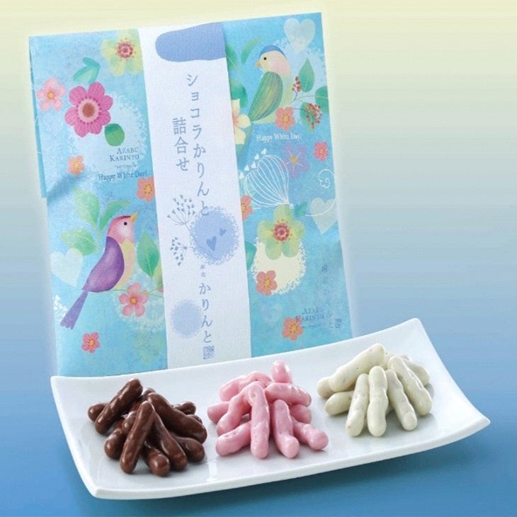 麻布かりんとホワイト、ミルク、苺の3種のショコラかりんとを、花と小鳥がデザインされたブルーのホワイトデー限定パッケージに。