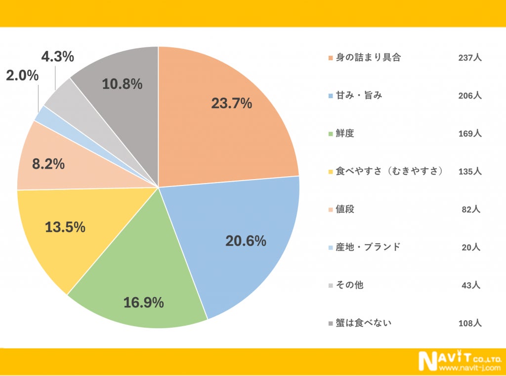 蟹を食べる際に重視するポイントについては、「身の詰まり具合」が23.7%と一番多く回答を頂きました。2番目は「甘み・旨み」が20.6%、3番目は「鮮度」が16.9%と続いています。