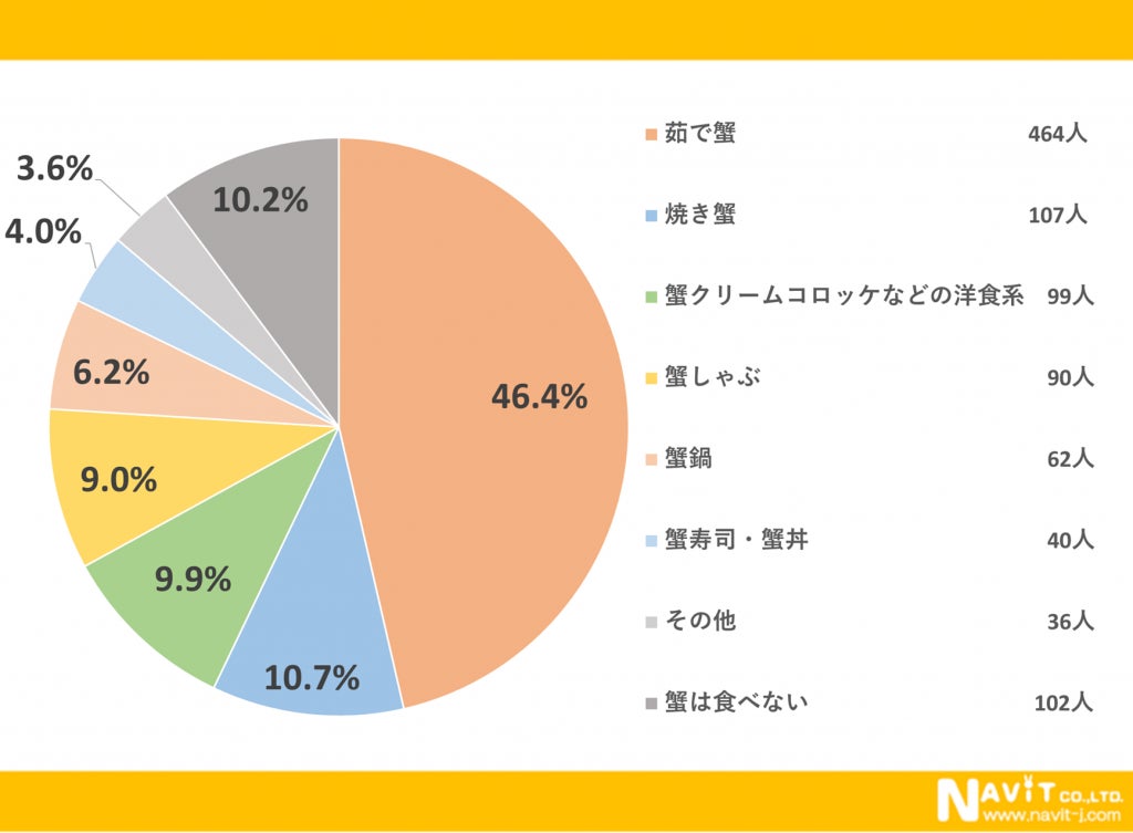 蟹料理で一番好きな食べ方についてのアンケートでは、「茹で蟹」が一番多く、46.4%と半分近くの方が選択しました。次が「焼き蟹」で10.7%、「カニクリームコロッケなどの洋食系」が9.9%と続く結果になりました。