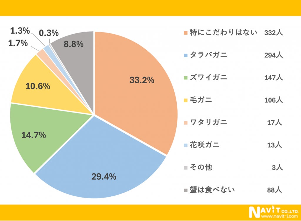 好きな蟹の種類についてのアンケートで1番多かった回答は、「タラバガニ」で29.4%でした。次に多かったのが「ズワイガニ」で14.7%、3番目に「毛ガニ」が10.6%と続く結果になりました。