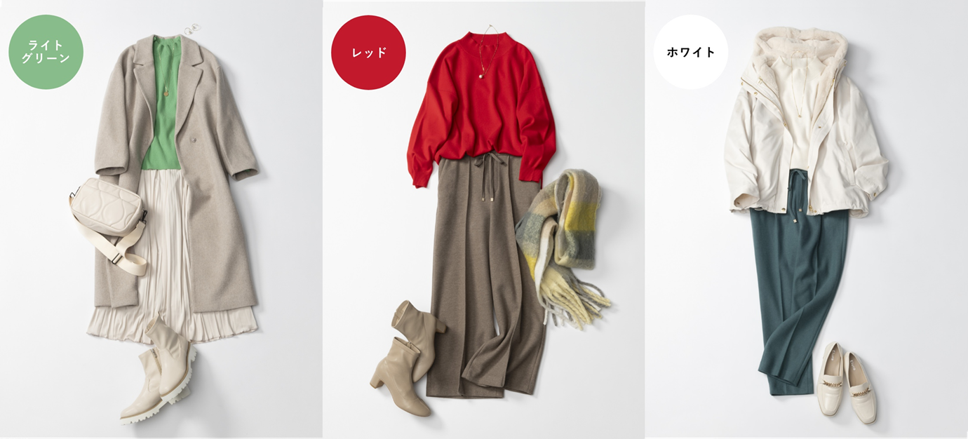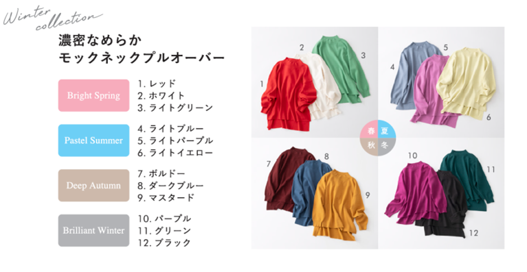 Eluraの冬シーズン、毎年大人気ニット「濃密なめらかモックネックプルオーバー」のカラー展開を、日本カラリスト協会が監修。ブライトスプリング・パステルサマー・ディープオータム・ブリリアントウィンターの4つのパーソナルカラーに寄り添った全12色展開で発売します。また、各カラーに対応し、今シーズンEluraで展開するレギュラー商品をふんだんに用いた全身コーディネートも、パーソナルカラーの理論に基づき同協会監修のもとそれぞれ提案しています。