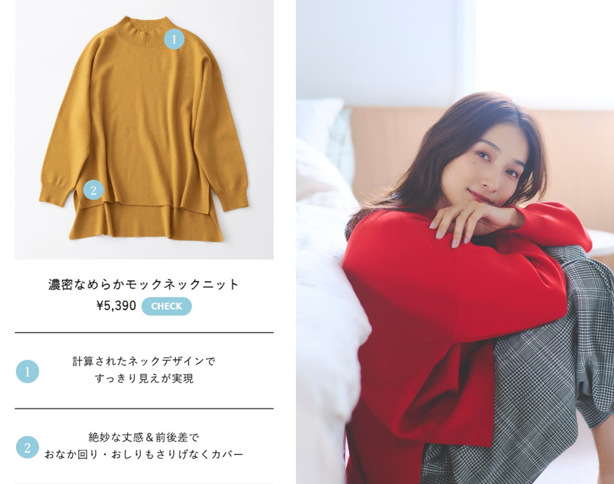 「似合う色がわからない…」「若いころ似合っていた色が似合わなくなってしまった」「何を着ても顔色がくすんでしまう…」など、大人女性ならではの色に関する洋服選びのお悩みに着目し、この秋初めて「抜け感Vネックニット」を日本カラリスト協会に監修いただきました。大好評だった第1弾に続き、今回は冬シーズンEluraで人気No.1のニット「濃密なめらかモックネックニット」を、色彩理論に基づいたパーソナルカラーに対応した全12色で展開。吸湿発熱機能+ジンジャーモイスト成分配合で暖かくしっとりとした着心地と、大人女性のために考え抜かれた素敵見え・体形カバーも同時にかなう秀逸なニットが、より一層様々な大人女性に寄り添ったアイテムに進化しました。