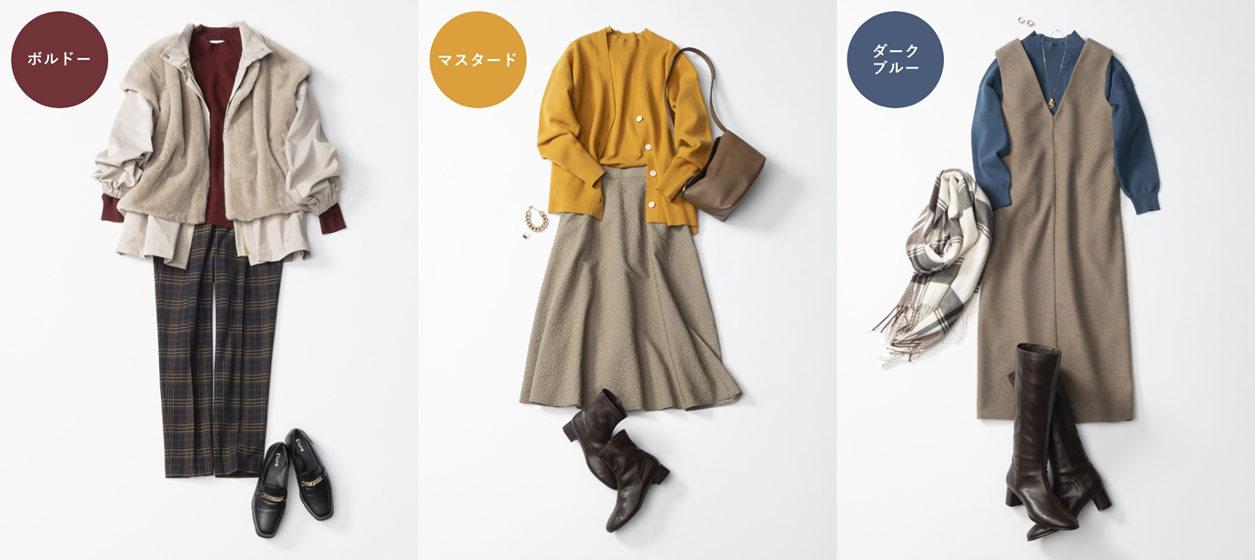 特徴 :深みのあるナチュラルカラーで大人の装い。知的で落ち着いた印象。