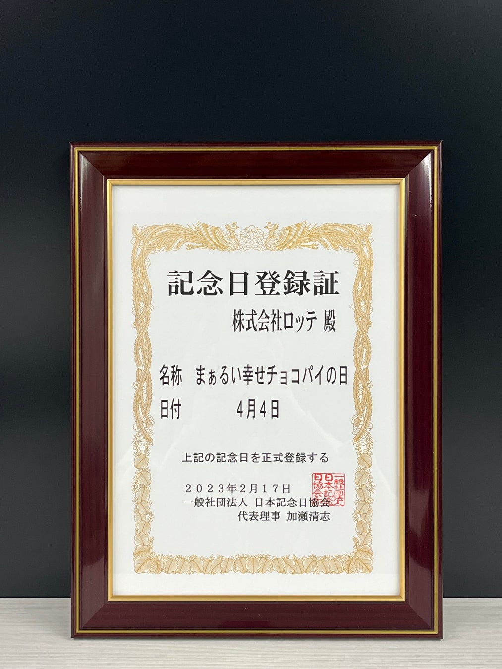 チョコパイは、安心感ある美味しさと満足感で、日常の中で少しの幸せをくれる存在であり続けたいと考えております。今回2023年で40周年を迎えるタイミングに、 4月4日『幸せの日』に掛け合わせ、日本記念日協会より『まぁるい幸せ チョコパイの日』認定、記念日認定を頂くことができました。