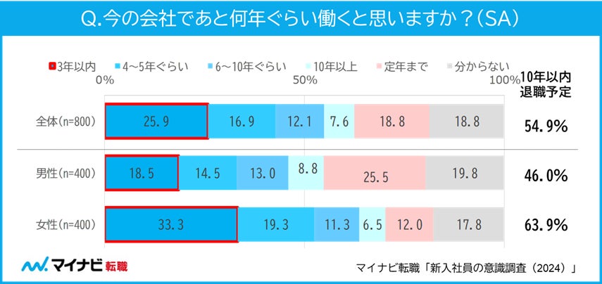 新入社員の勤続意向年数は「3年以内」が25.9%、「10年以内」では54.9%となった。