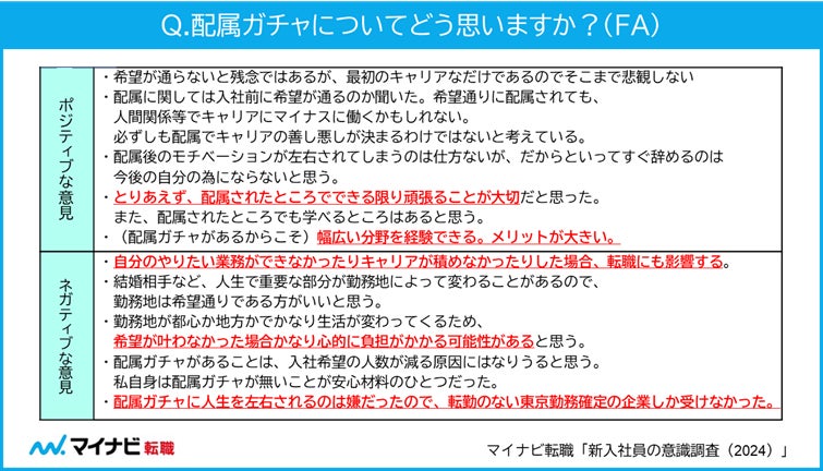 ◆“配属ガチャ”に外れたと感じている人は11.1%で少数派。ポジティブ意見として「まずは与えられた環境で頑張る」「幅広い分野を経験できる」などの声も
