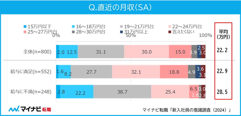 直近の月収について聞いたところ、全体の平均は「22.2万円」。給与に満足している人の平均月収は22.9万円で、不満と回答した人の平均月収は20.5万円となった。【図1】