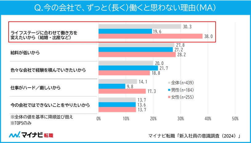 男女別に勤続意向年数をみると「3年以内」と答えたのは、男性が18.5%、女性が33.3%だった。今の会社で長く働き続けない理由を聞くと、「ライフステージに合わせて働き方を変えたいから」で、男性が19.6%に対し女性が38.0%と約2倍の結果になり、女性は環境の変化に備え早めにキャリアプランを立てていることがうかがえる。【図3、4】