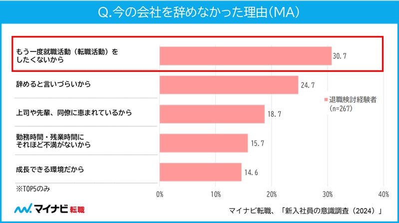 なお、今の会社を辞めなかった理由は、「もう一度就職活動をしたくないから」(30.7%)が最多となり、次いで「辞めると言いづらいから」(24.7%)「上司や先輩、同僚に恵まれているから」(18.7%)が続いた。【図5、6】