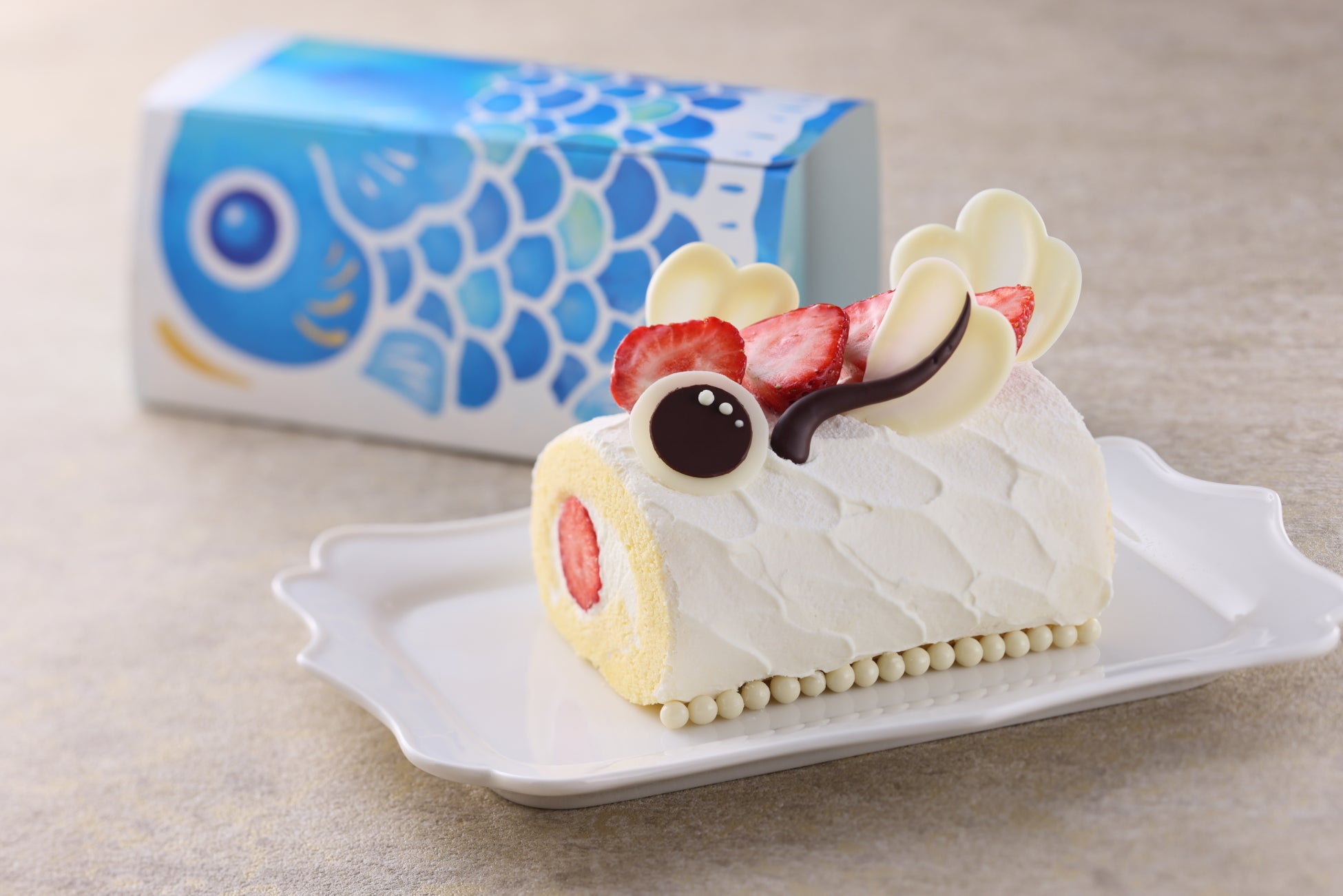5月5日の端午の節句を祝う「こどもの日ケーキ」は、丸ごと苺を巻いて断面を美しく仕上げたロールケーキ。生クリームとホワイトチョコレートを使いウロコに見立てた表面に、可愛い目玉とひげをつけて、元気よく空を泳ぐこいのぼりを再現しました。パティシエの遊び心溢れるケーキで、子どもたちが主役の大切な一日をお過ごしください。