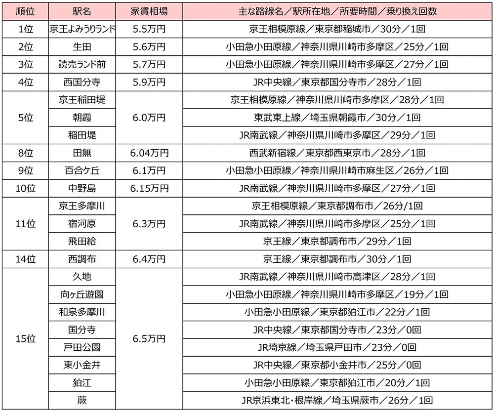 上位には新宿駅まで乗り換え1回の駅が続きますが、15位までくると国分寺駅のように乗り換え0回の駅もランクインしました。国分寺駅は家賃相場6万5000円で、JR中央線の通勤特快に乗ると約23分で新宿駅へ。国分寺駅の1駅隣に位置する4位西国分寺駅(家賃相場5万9000円)は乗り換え1回・約28分との調査結果になりましたが、これは通勤特快が停車しないためです。