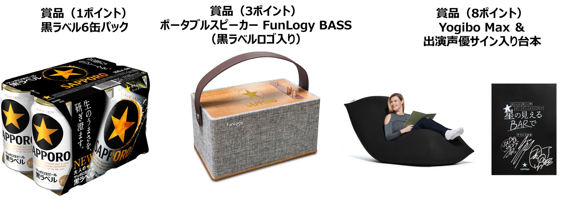 またオーディオドラマを1話聴くごとに1ポイントずつ獲得、このポイントを使って応募をすると抽選で、「ポータブルスピーカー FunLogy BASS (黒ラベルロゴ入り)」や「Yogibo Max & 出演声優サイン入り台本」などの豪華賞品が当たります。