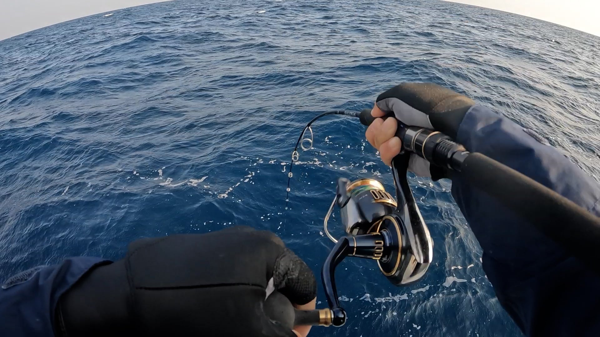 船を走らせること2時間、ポイントに到着。早速ジグを落とし、誘いをいれる。と、船長から「下から30mに反応」アナウンスが入る。