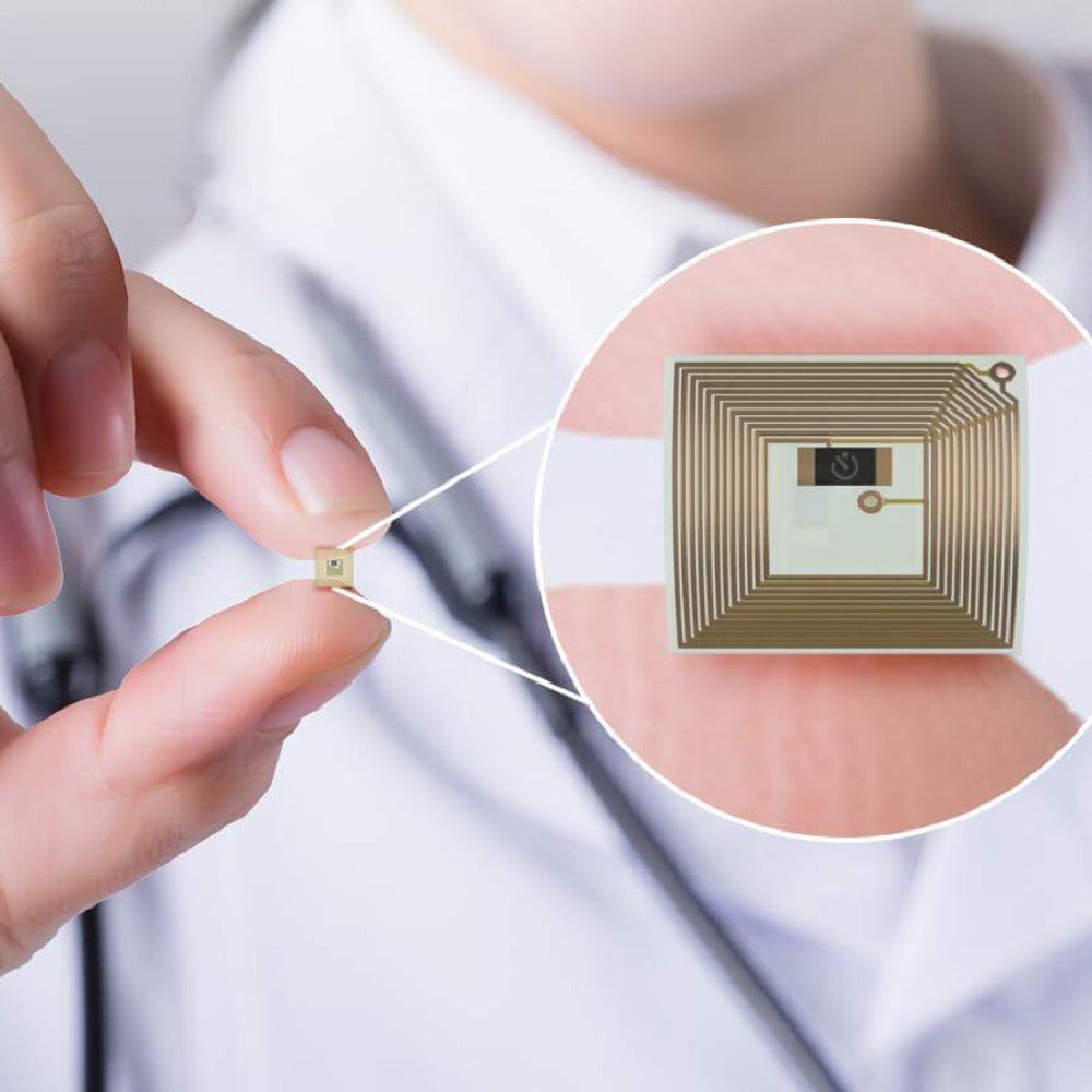 ※ 写真ではマイクロチップのサイズが分かりやすいように爪の表面に貼り付けています。