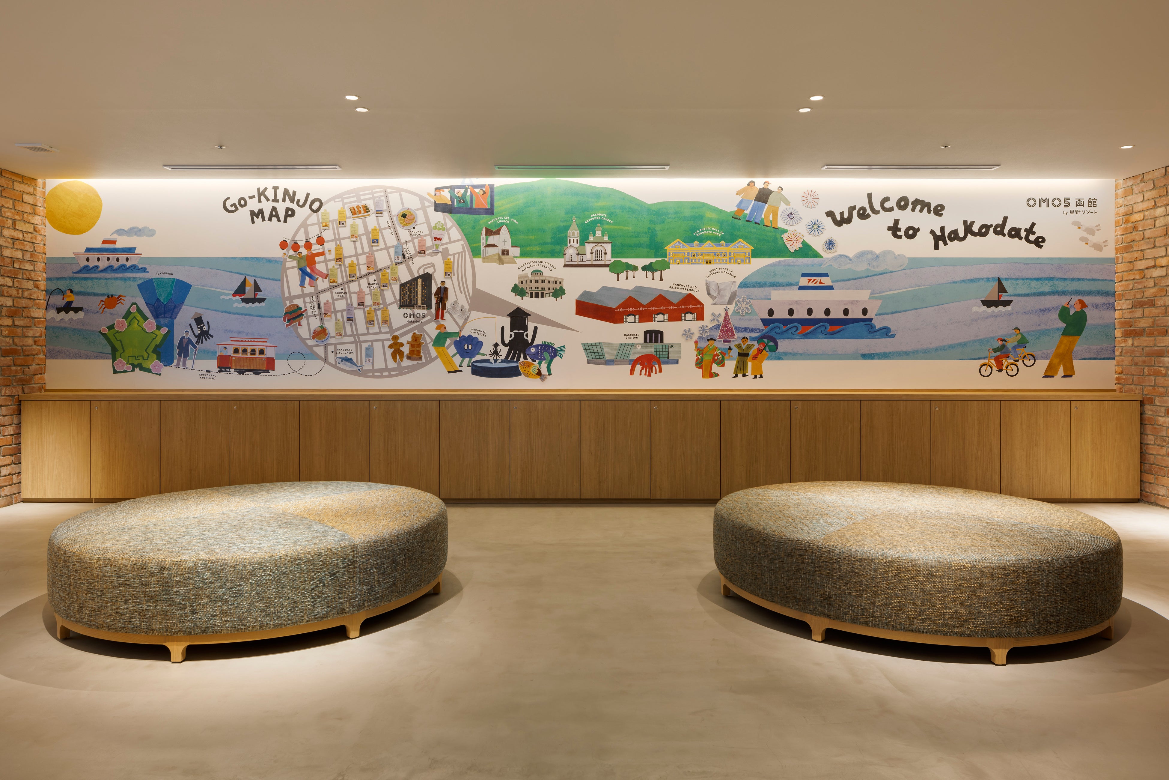「テンションあがる『街ナカ』ホテル」ブランドとして、星野リゾートが全国に展開する「OMO」。 今回は、北海道・函館駅前の好立地に建つ既存ホテルを「OMO」にリブランドして、増築およびリノベーションした施設になります。施設のコンセプトである「百二十%ハコダテ」をテーマに、函館ならではの要素をホテルの随所に表現し、OMOらしい旅のテンションを上げるデザインを心掛けました。エントランスでは、函館の観光をモチーフに描いた巨大なステンドグラスのアートがゲストを出迎えます。ゲストのパブリックスペースである「OMOベース」では、周辺の観光地や店舗の情報が描かれた「ご近所マップ」や、観光に出かける前やホテルに戻った後に仲間とくつろぐスペースなど、「ゲストの過ごし方をデザインすること」をコンセプトにさまざまな過ごし方を提案しています。ビュッフェレストラン「OMOダイニング」では、函館の観光名所である五稜郭の星型をモチーフにしたライブキッチンを配し、函館漁港の市場をテーマに漁火のイカ釣りランプや漁の網を使ったペンダントライトなどで活気のあるダイニングを表現しました。増築したレストラン部分では、明るく開放的なホールを創り出し、既存の天井高が低く落ち着きのあるエリアとの対比で、空間にメリハリをつくり出しています。また、イカ墨で染色したアートが客席エリアにアクセントを加えています。客室の壁には、函館山の夜景をテーマにしたイラストが描かれています。また、函館のイカを隠しテーマに、部屋のさまざまなところにイカのイメージを見つけることができ、より旅のテンションを上げるデザインにしています。星野リゾートらしさを感じさせる、旅を凝縮したような「テンションあがる」施設がまた一つ誕生しました。