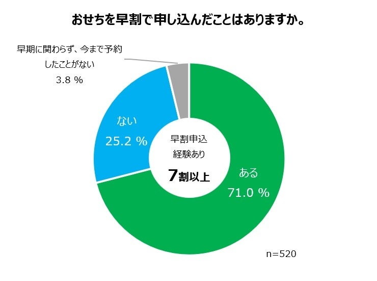 ファミリーマートが実施した調査で、「おせちに早割があれば申し込みたいか」尋ねたところ、86%の方が「そう思う」「まあ思う」と回答(図1)。また、「おせちを早割で申し込んだことがあるか」との問いには、71%の方が「ある」と回答しており(図2)、2026年のおせちについても、物価高を背景に早割への関心は高く、早割期間の予約増加に繋がったと考えられます。